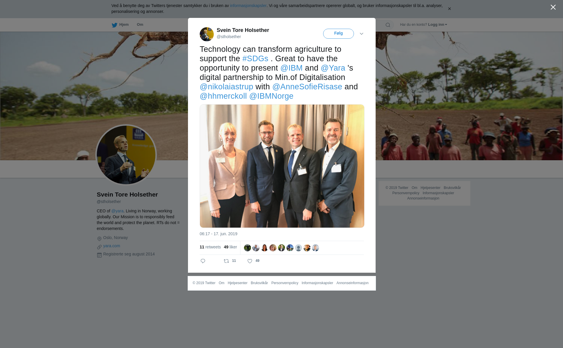RT @stholsether: Technology can transform agriculture to support the #SDGs . Great to have the opportunity to present @IBM and @Yara 's digital partnership to Min.of Digitalisation @nikolaiastrup with @AnneSofieRisase and @hhmerckoll @IBMNorge https://t.co/Z8wFpNP1aU