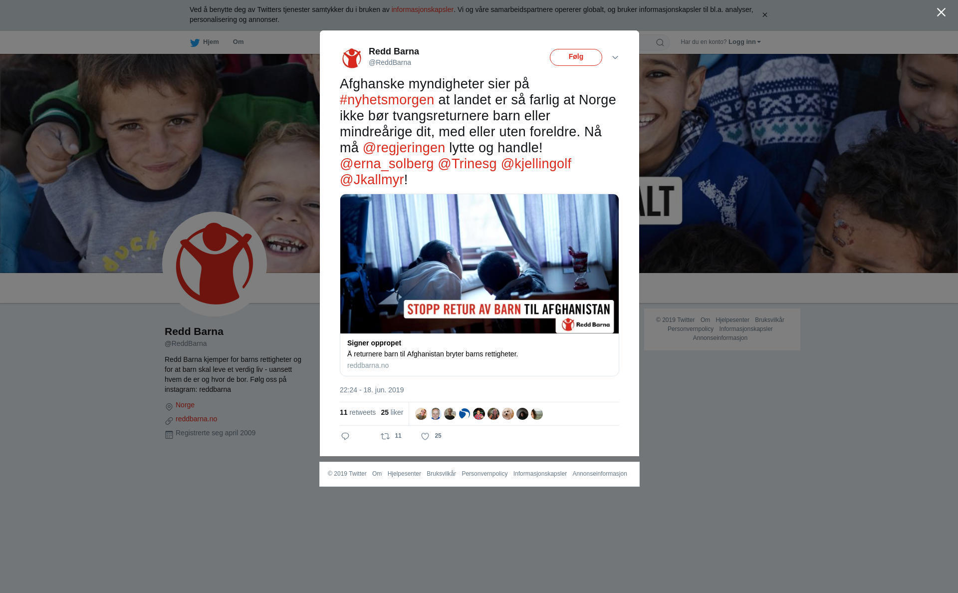 RT @ReddBarna: Afghanske myndigheter sier på #nyhetsmorgen at landet er så farlig at Norge ikke bør tvangsreturnere barn eller mindreårige dit, med eller uten foreldre. Nå må @regjeringen lytte og handle! @erna_solberg @Trinesg @kjellingolf @Jkallmyr! https://t.co/0AbNGfdclc