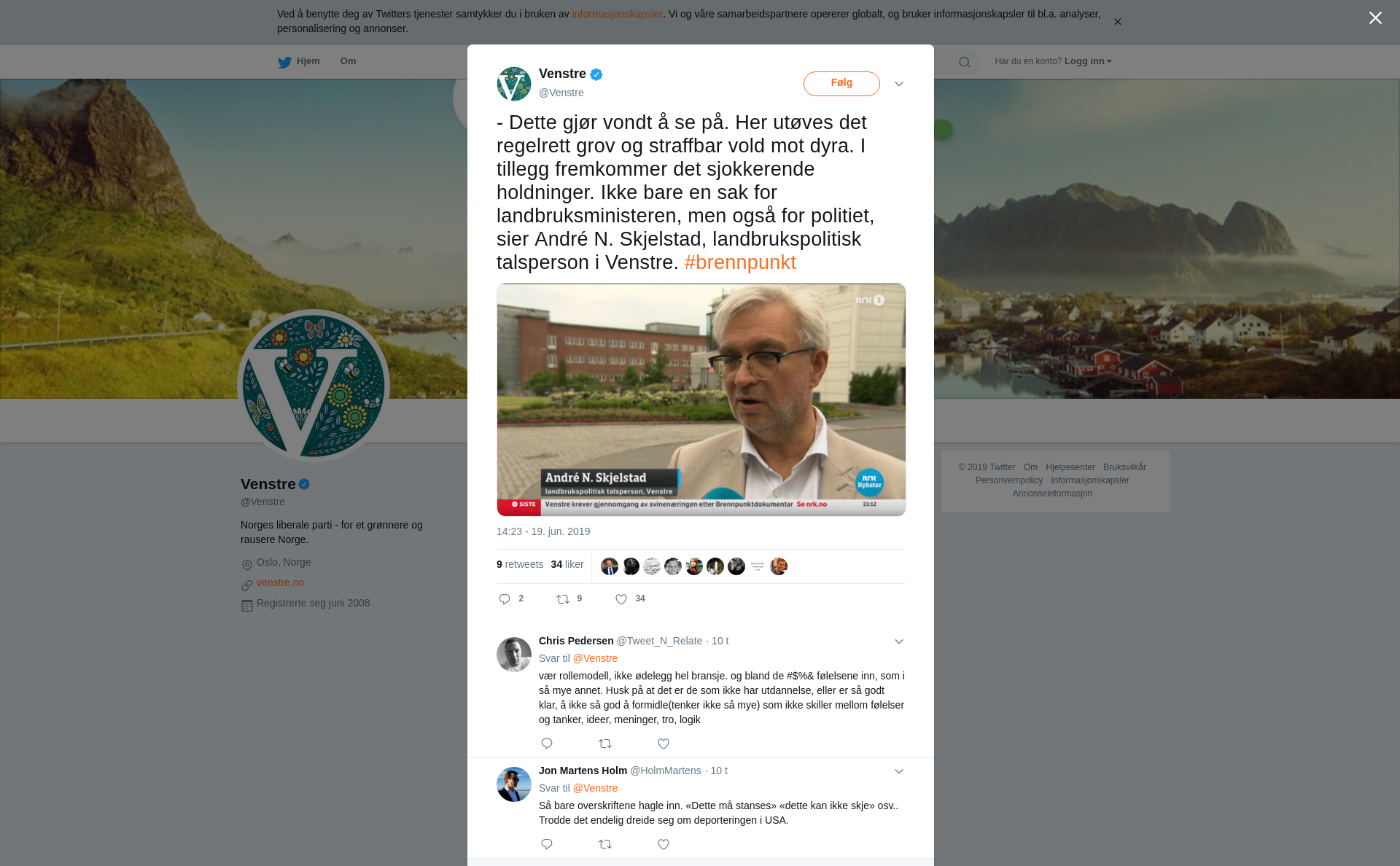 - Dette gjør vondt å se på. Her utøves det regelrett grov og straffbar vold mot dyra. I tillegg fremkommer det sjokkerende holdninger. Ikke bare en sak for landbruksministeren, men også for politiet, sier André N. Skjelstad, landbrukspolitisk talsperson i Venstre. #brennpunkt https://t.co/XFSihhyF3I