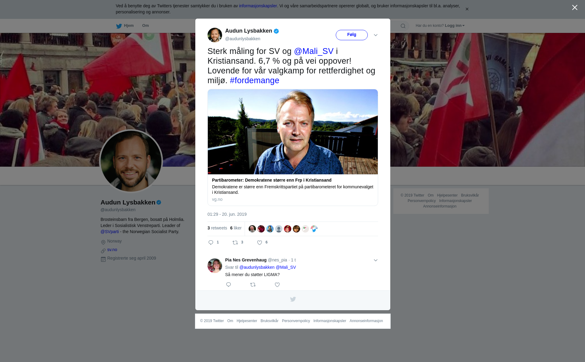 RT @audunlysbakken: Sterk måling for SV og @Mali_SV i Kristiansand. 6,7 % og på vei oppover! Lovende for vår valgkamp for rettferdighet og miljø. #fordemange https://t.co/CHHWjwG6jS