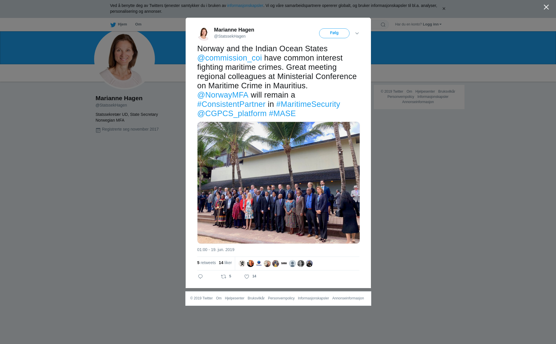RT @StatssekHagen: Norway and the Indian Ocean States @commission_coi have common interest fighting maritime crimes. Great meeting regional colleagues at Ministerial Conference on Maritime Crime in Mauritius. @NorwayMFA will remain a #ConsistentPartner in #MaritimeSecurity @CGPCS_platform #MASE https://t.co/T705nwEJSB