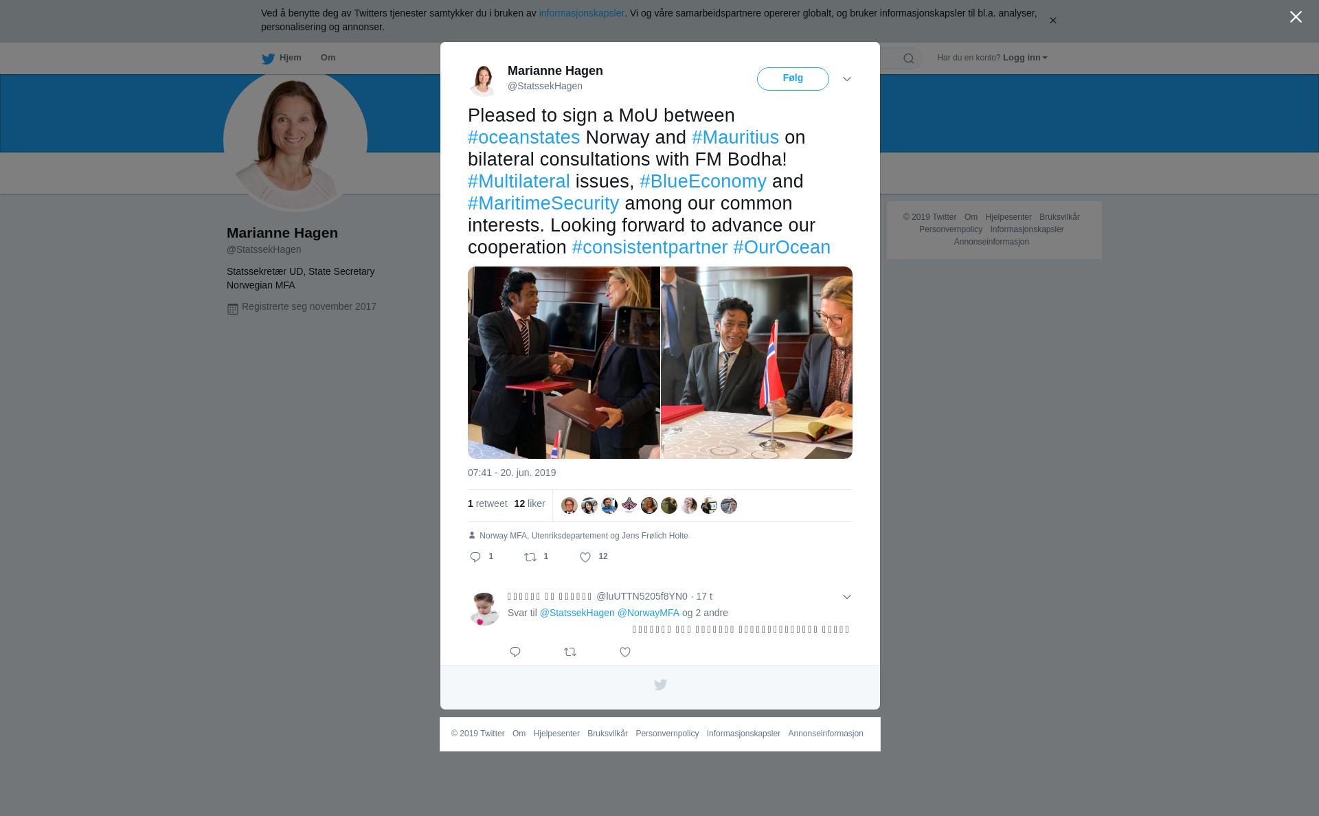 RT @StatssekHagen: Pleased to sign a MoU between #oceanstates Norway and #Mauritius on bilateral consultations with FM Bodha! #Multilateral issues, #BlueEconomy and #MaritimeSecurity among our common interests. Looking forward to advance our cooperation #consistentpartner #OurOcean https://t.co/6Q5pyOWX0J