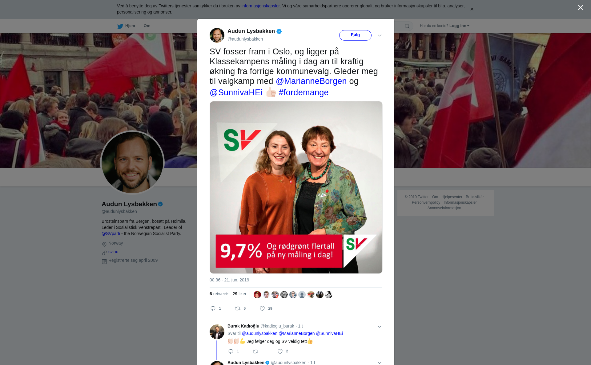 SV fosser fram i Oslo, og ligger på Klassekampens måling i dag an til kraftig økning fra forrige kommunevalg. Gleder meg til valgkamp med @MarianneBorgen og @SunnivaHEi 👍🏻 #fordemange https://t.co/varHFnwB9L