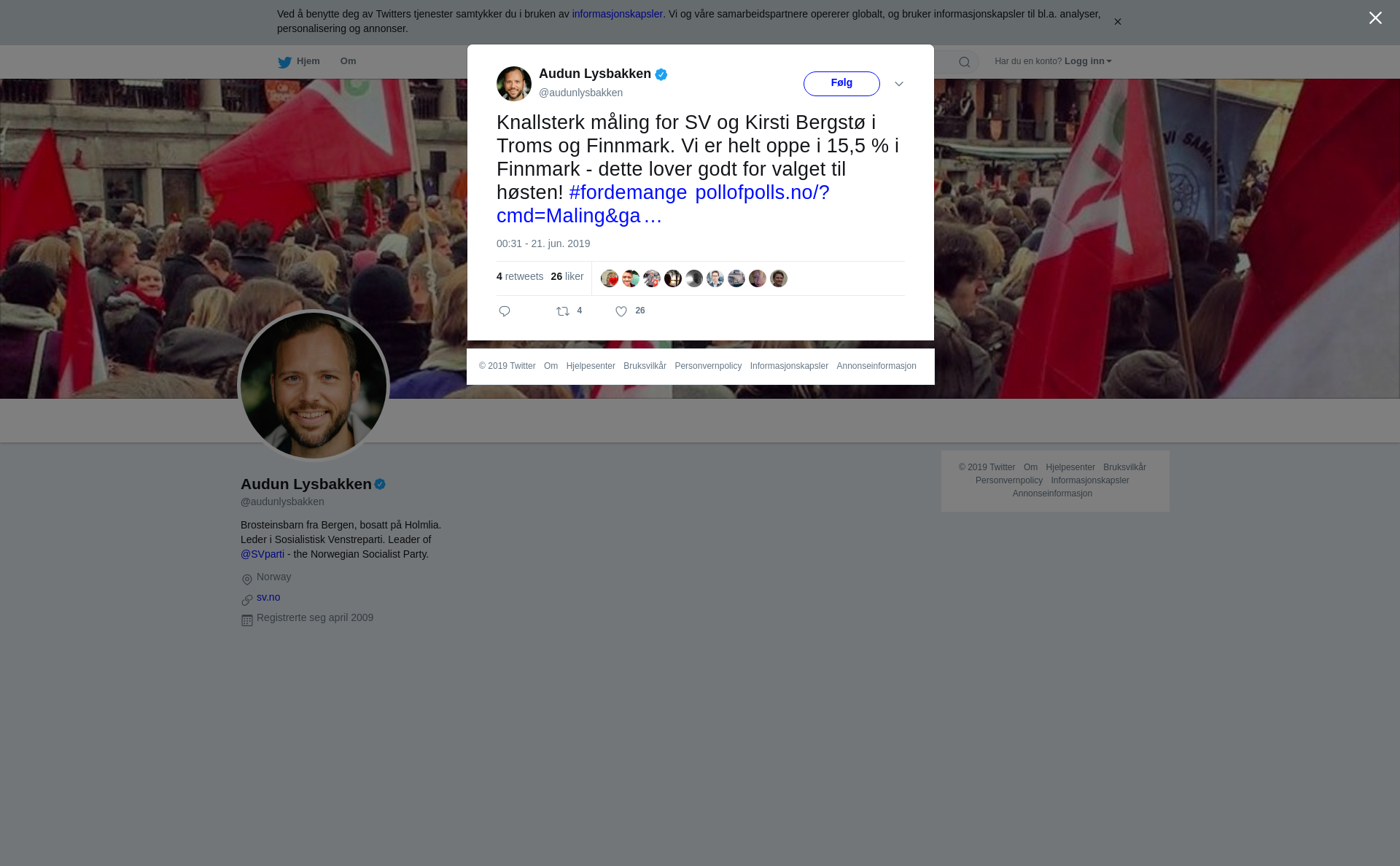 Knallsterk måling for SV og Kirsti Bergstø i Troms og Finnmark. Vi er helt oppe i 15,5 % i Finnmark - dette lover godt for valget til høsten! #fordemange https://t.co/FYgWAL8lPO