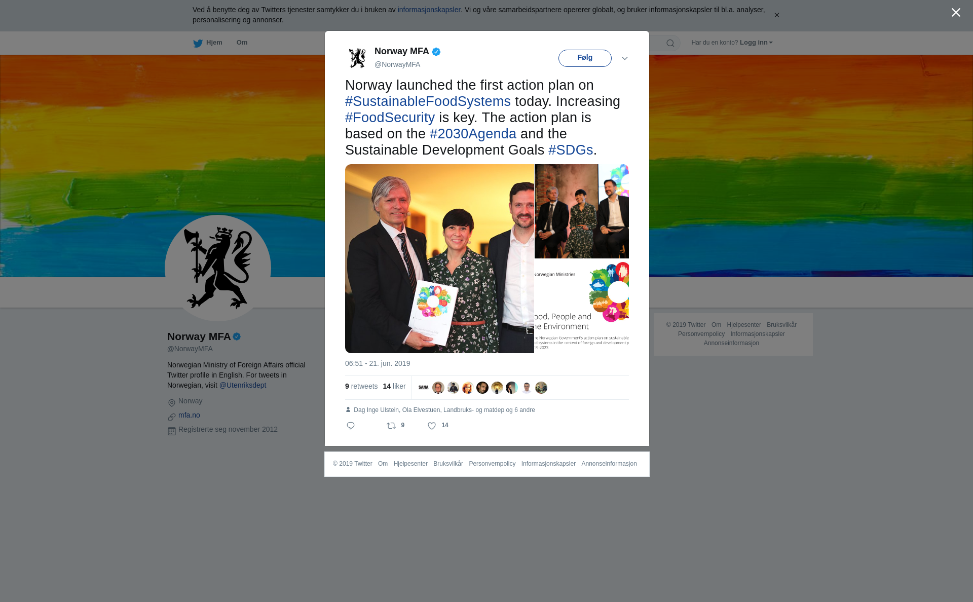 Norway launched the first action plan on #SustainableFoodSystems today. Increasing #FoodSecurity is key. The action plan is based on the #2030Agenda and the Sustainable Development Goals #SDGs. https://t.co/BwCm53kAdB