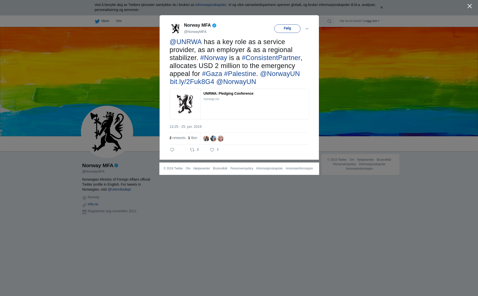 Statement by Ambassador Mona Juul at the pledging con ference for United Nations Relief and Works Agency for Palestine Refugees, 25 June 2019. Secretary General, President, The strong international support for United Nations Relief and Works Agency for Palestine Refugees (UNRWA) became especially clear last year when the agency faced an unprecedented financial crisis. This mobilized both existing and new donors. Impressively all pledges were delivered upon, and the agency was enable to sustain its