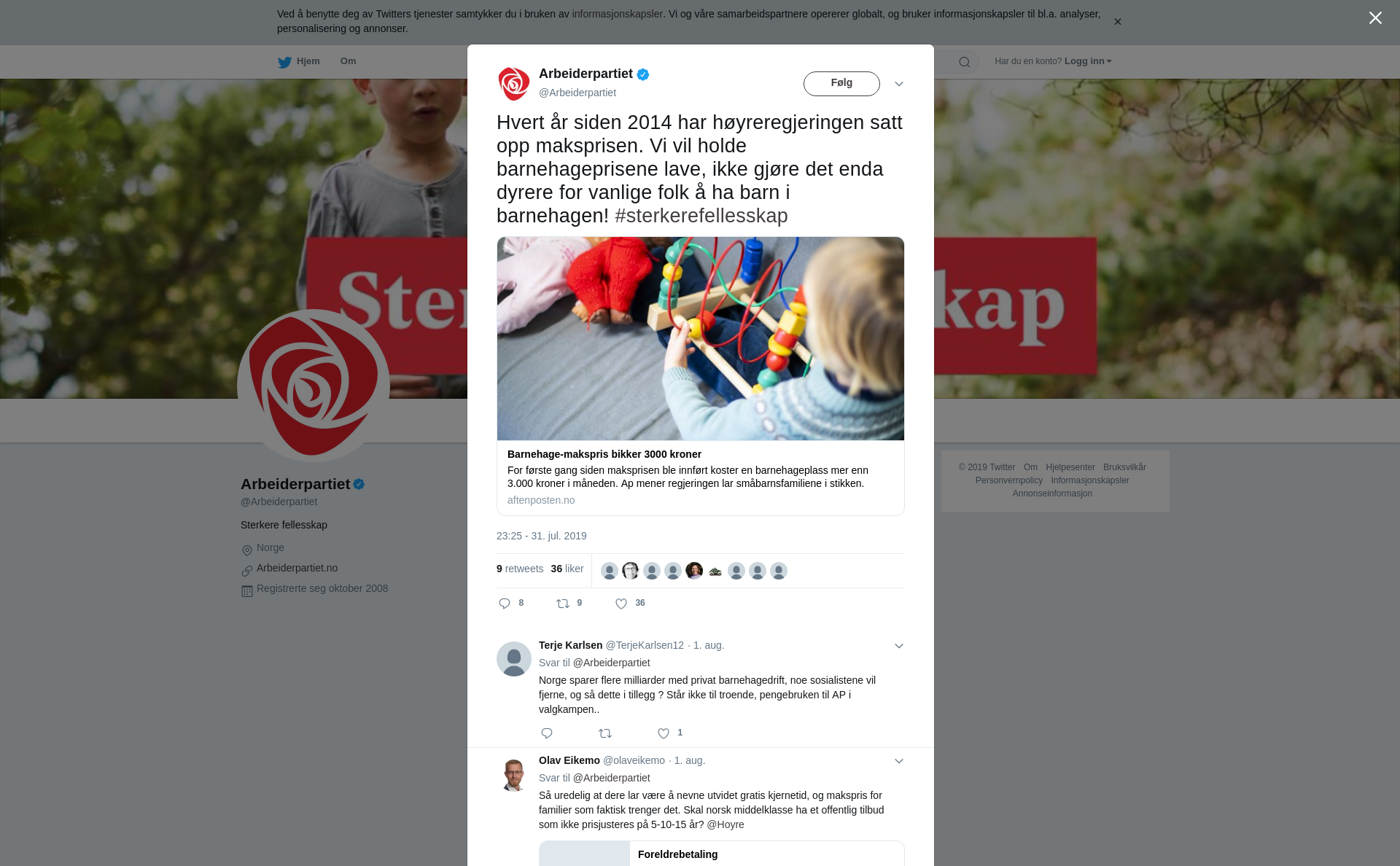 Hvert år siden 2014 har høyreregjeringen satt opp maksprisen. Vi vil holde barnehageprisene lave, ikke gjøre det enda dyrere for vanlige folk å ha barn i barnehagen! #sterkerefellesskap https://t.co/bJEn1mSKYk