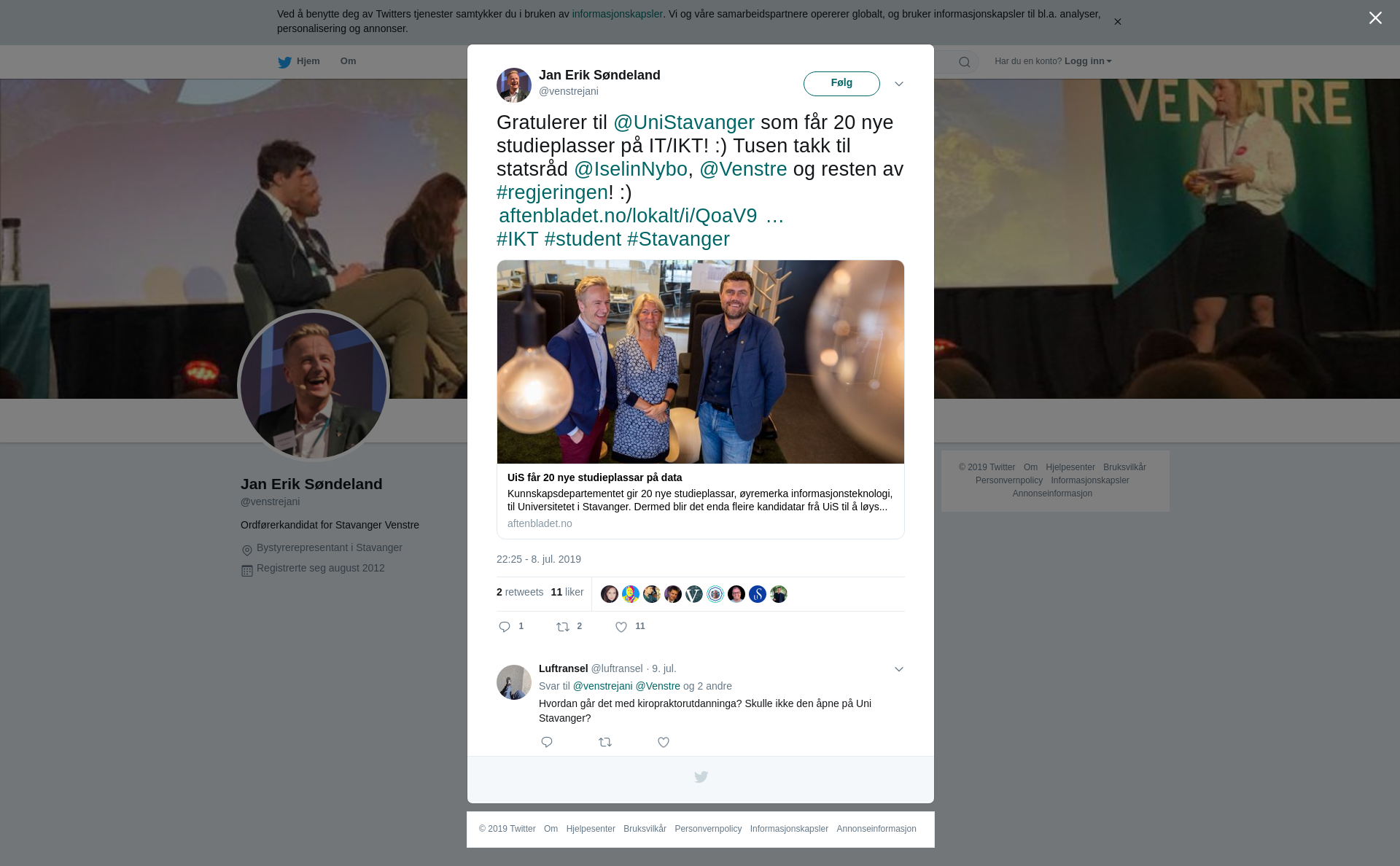 RT @venstrejani: Gratulerer til @UniStavanger som får 20 nye studieplasser på IT/IKT! :) Tusen takk til statsråd @IselinNybo, @Venstre og resten av #regjeringen! :)