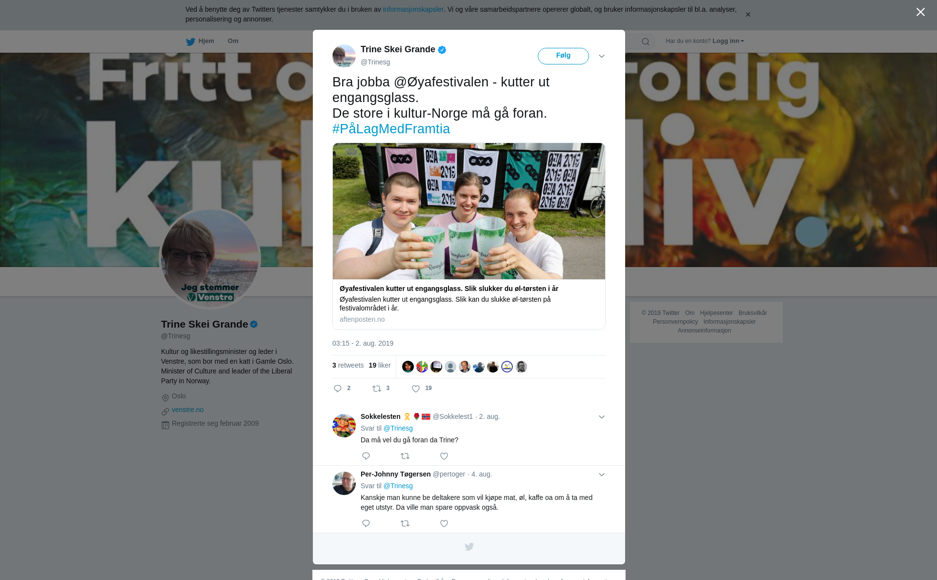 Bra jobba @Øyafestivalen - kutter ut engangsglass. De store i kultur-Norge må gå foran. #PåLagMedFramtia https://t.co/KqSqsmAsrH