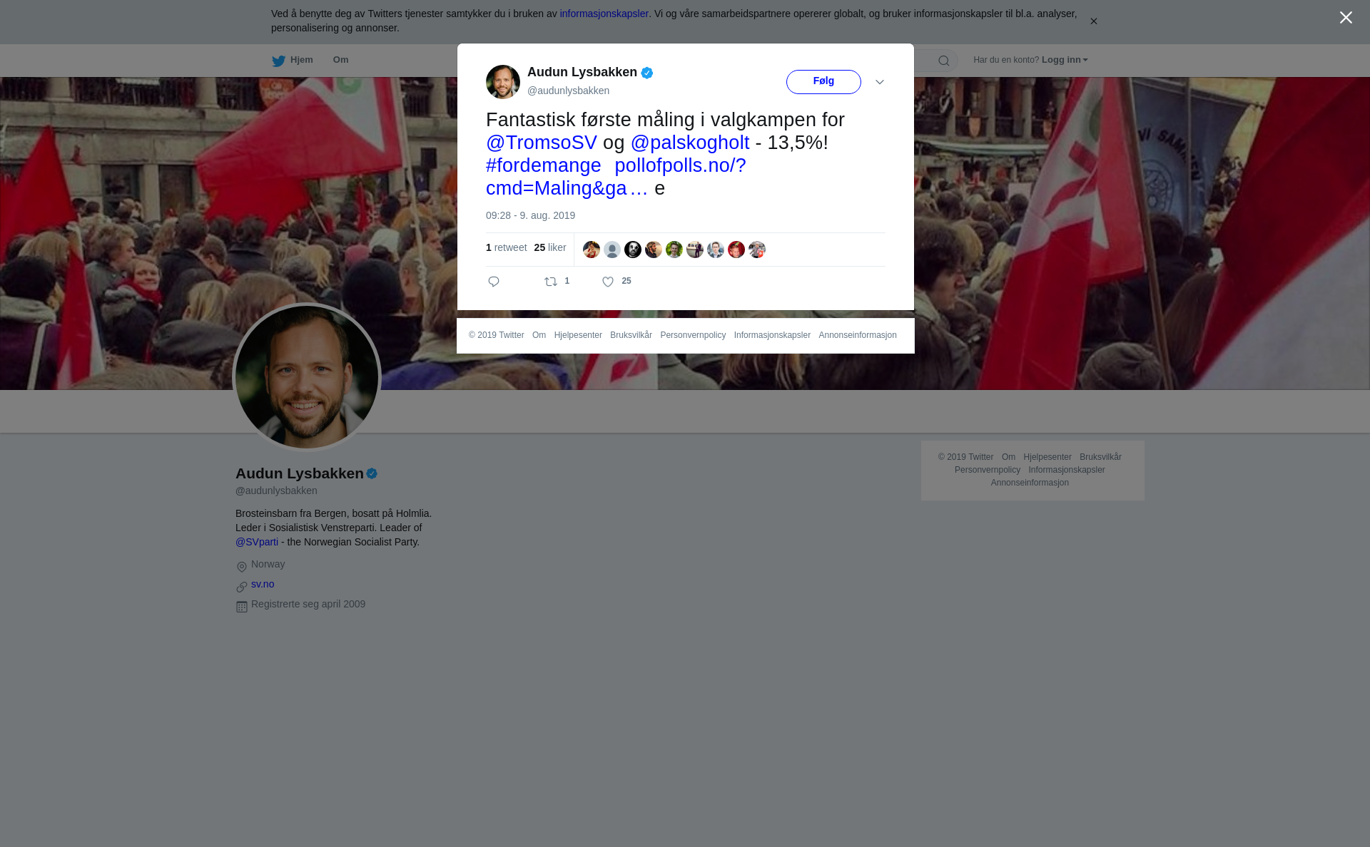 Fantastisk første måling i valgkampen for @TromsoSV og @palskogholt - 13,5%! #fordemange https://t.co/WZ7uuVmANy e
