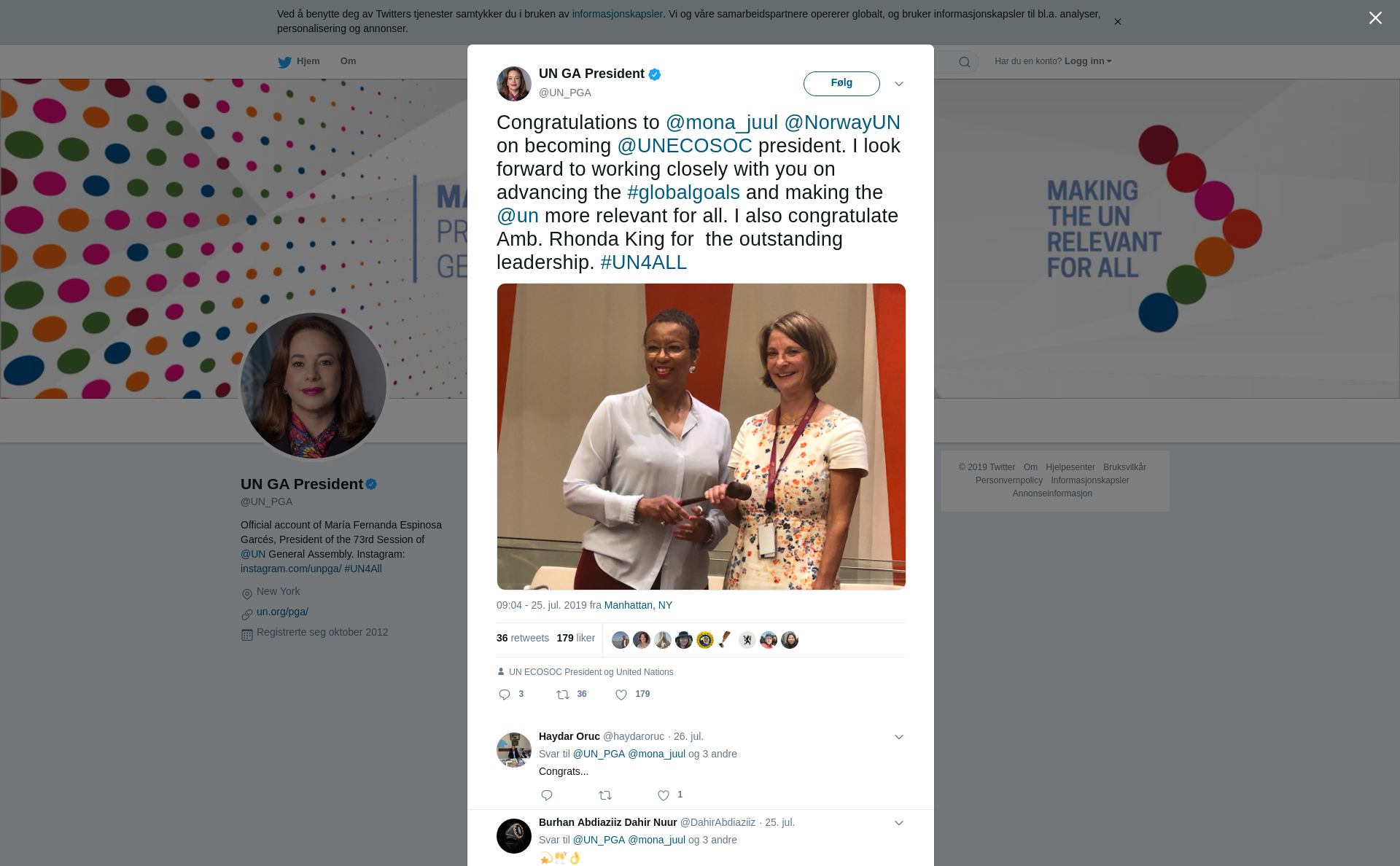 RT @UN_PGA: Congratulations to @mona_juul @NorwayUN on becoming @UNECOSOC president. I look forward to working closely with you on advancing the #globalgoals and making the @un more relevant for all. I also congratulate Amb. Rhonda King for the outstanding leadership. #UN4ALL https://t.co/h4zy3z4xiL