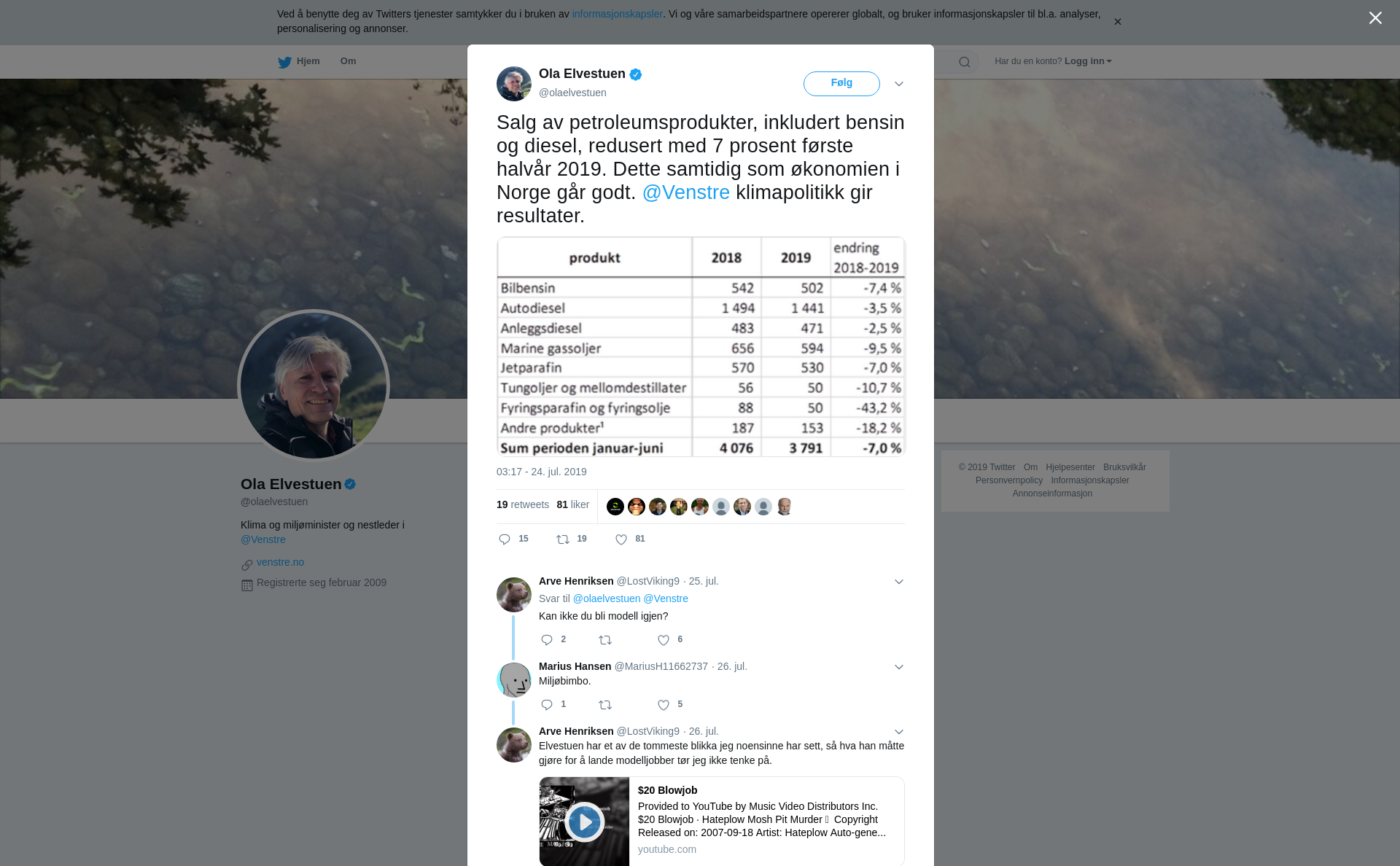 Salg av petroleumsprodukter, inkludert bensin og diesel, redusert med 7 prosent første halvår 2019. Dette samtidig som økonomien i Norge går godt. @Venstre klimapolitikk gir resultater. https://t.co/xbztkAZB2A