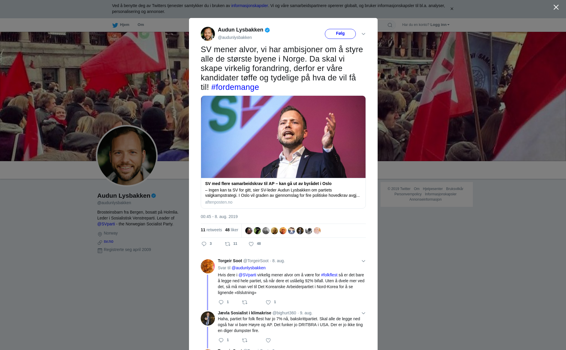 RT @audunlysbakken: SV mener alvor, vi har ambisjoner om å styre alle de største byene i Norge. Da skal vi skape virkelig forandring, derfor er våre kandidater tøffe og tydelige på hva de vil få til! #fordemange https://t.co/wh4K5jILDE