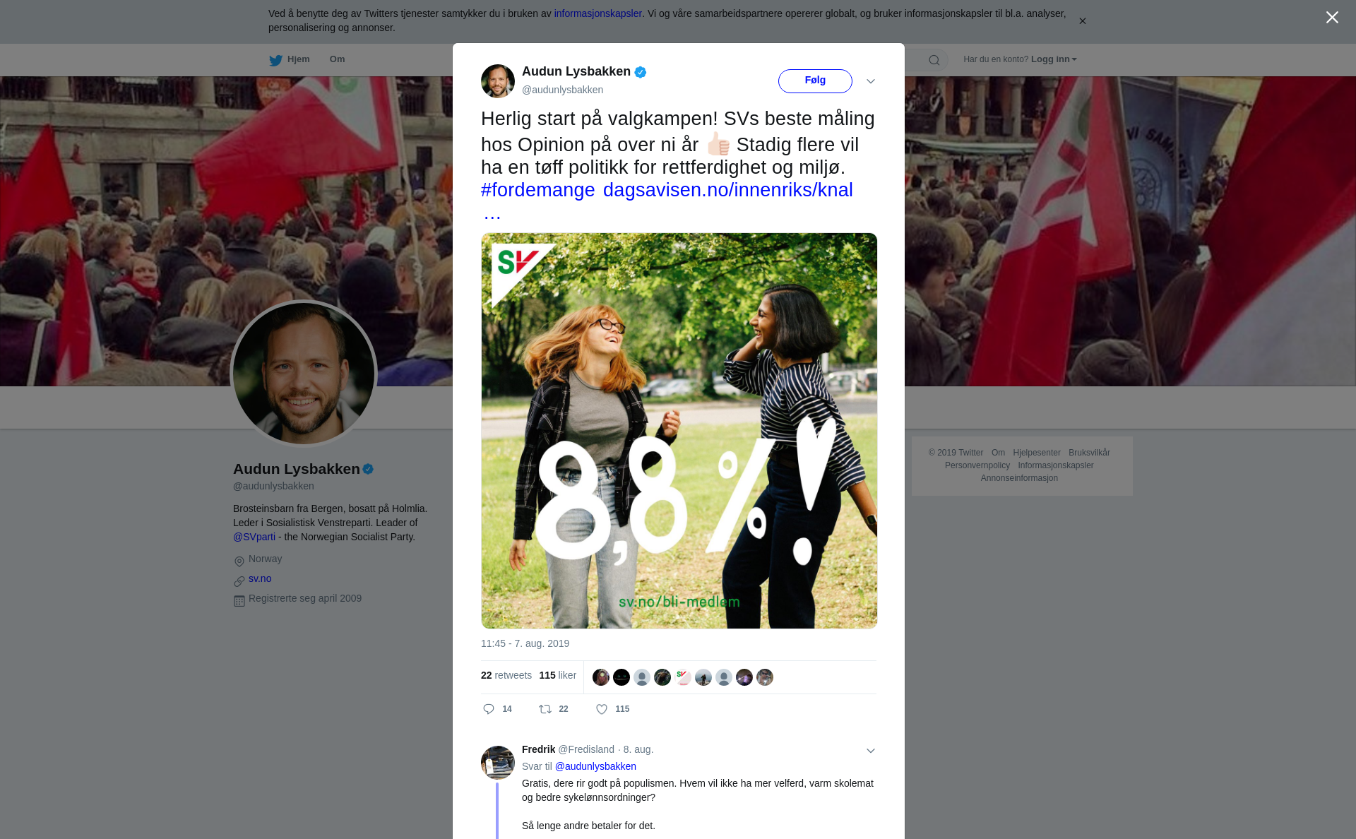 RT @audunlysbakken: Herlig start på valgkampen! SVs beste måling hos Opinion på over ni år 👍🏻 Stadig flere vil ha en tøff politikk for rettferdighet og miljø. #fordemange https://t.co/fi5ZbCfe8u https://t.co/rjUU2lgmoM