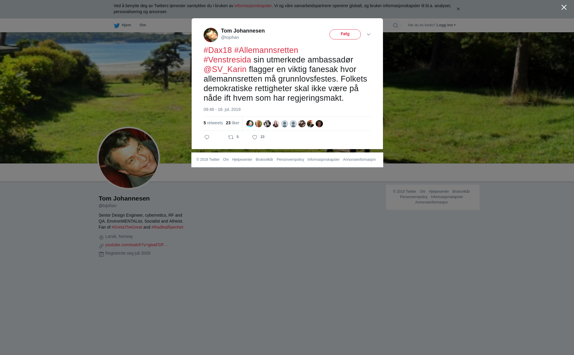 RT @tojohan: #Dax18 #Allemannsretten #Venstresida sin utmerkede ambassadør @SV_Karin flagger en viktig fanesak hvor allemannsretten må grun…