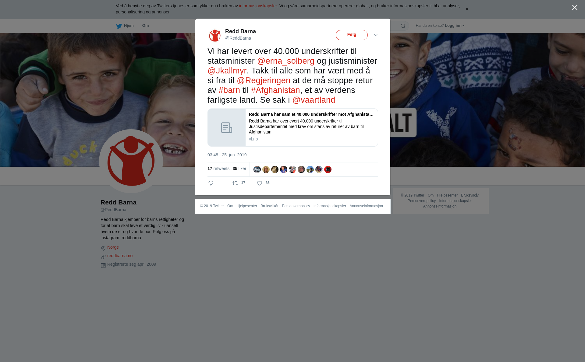 RT @ReddBarna: Vi har levert over 40.000 underskrifter til statsminister @erna_solberg og justisminister @Jkallmyr. Takk til alle som har vært med å si fra til @Regjeringen at de må stoppe retur av #barn til #Afghanistan, et av verdens farligste land. Se sak i @vaartland https://t.co/cTluyZBZy6