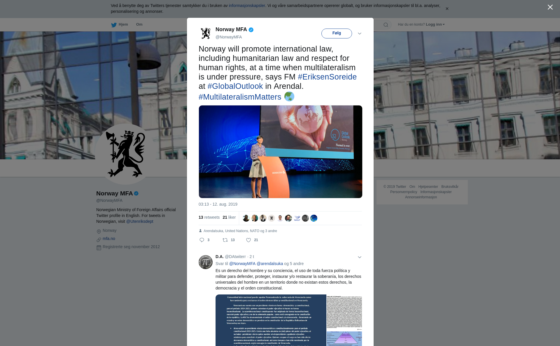 Norway will promote international law, including humanitarian law and respect for human rights, at a time when multilateralism is under pressure, says FM #EriksenSoreide at #GlobalOutlook in Arendal. #MultilateralismMatters 🌏 https://t.co/5gZG9F9nzh