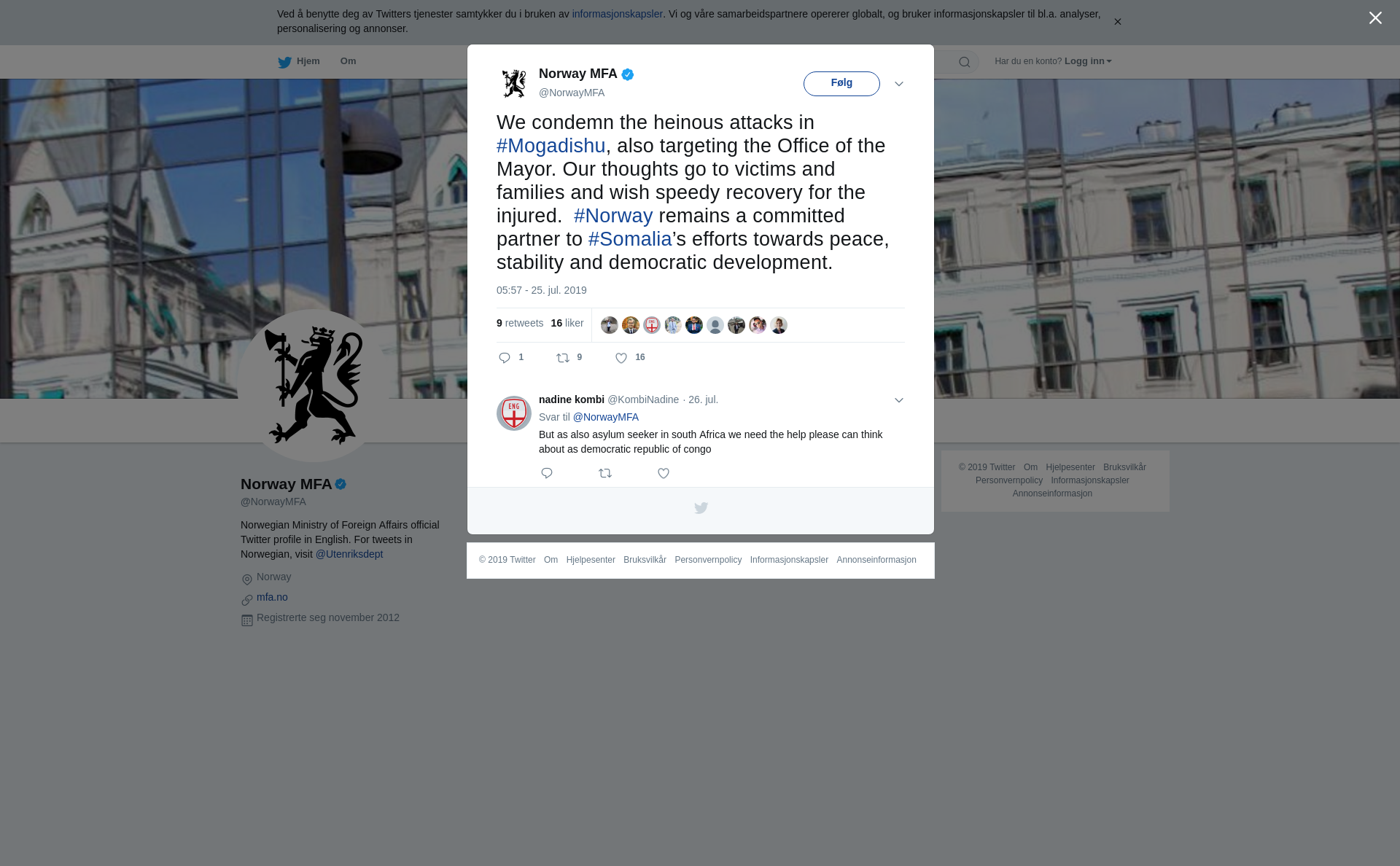 We condemn the heinous attacks in #Mogadishu, also targeting the Office of the Mayor. Our thoughts go to victims and families and wish speedy recovery for the injured. #Norway remains a committed partner to #Somalia’s efforts towards peace, stability and democratic development.