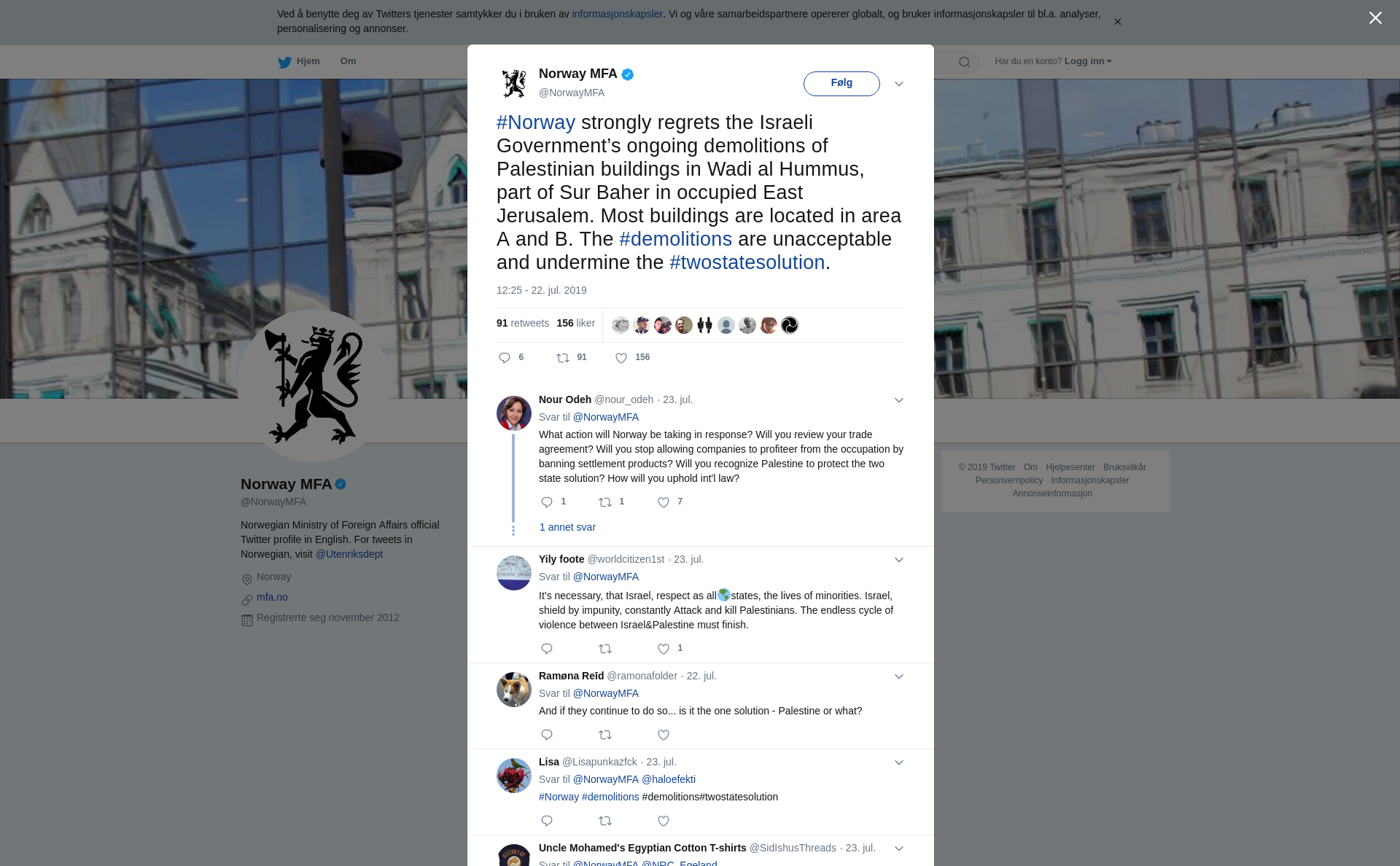 #Norway strongly regrets the Israeli Government’s ongoing demolitions of Palestinian buildings in Wadi al Hummus, part of Sur Baher in occupied East Jerusalem. Most buildings are located in area A and B. The #demolitions are unacceptable and undermine the #twostatesolution.
