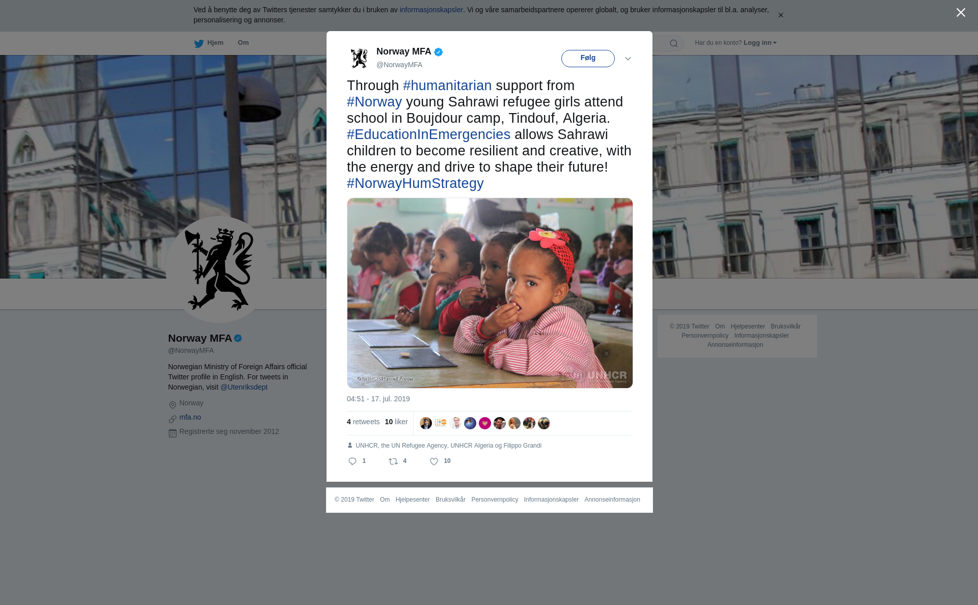 Through #humanitarian support from #Norway young Sahrawi refugee girls attend school in Boujdour camp, Tindouf, Algeria. #EducationInEmergencies allows Sahrawi children to become resilient and creative, with the energy and drive to shape their future! #NorwayHumStrategy https://t.co/n5MZMTabvz
