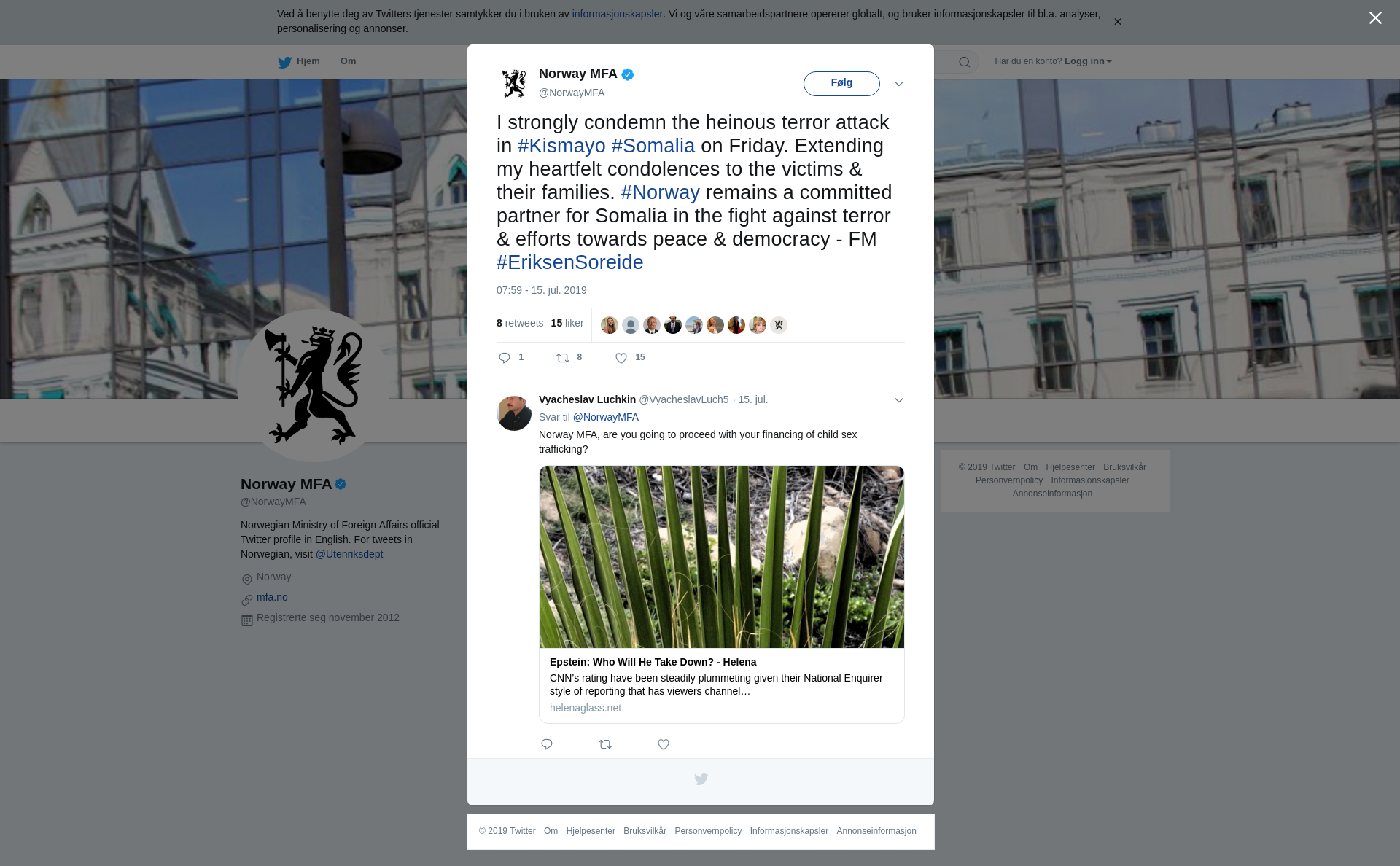 I strongly condemn the heinous terror attack in #Kismayo #Somalia on Friday. Extending my heartfelt condolences to the victims & their families. #Norway remains a committed partner for Somalia in the fight against terror & efforts towards peace & democracy - FM #EriksenSoreide