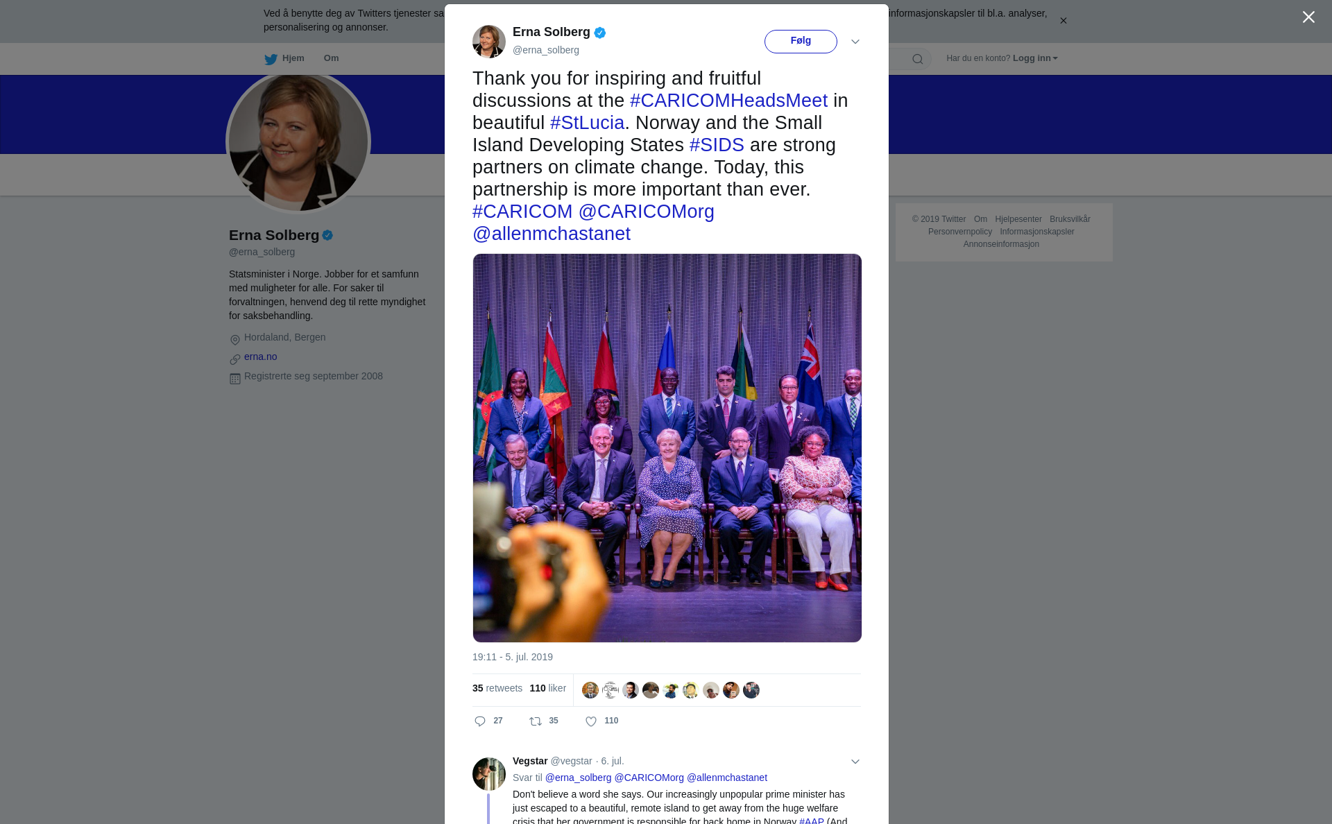 RT @erna_solberg: Thank you for inspiring and fruitful discussions at the #CARICOMHeadsMeet in beautiful #StLucia. Norway and the Small Island Developing States #SIDS are strong partners on climate change. Today, this partnership is more important than ever. #CARICOM @CARICOMorg