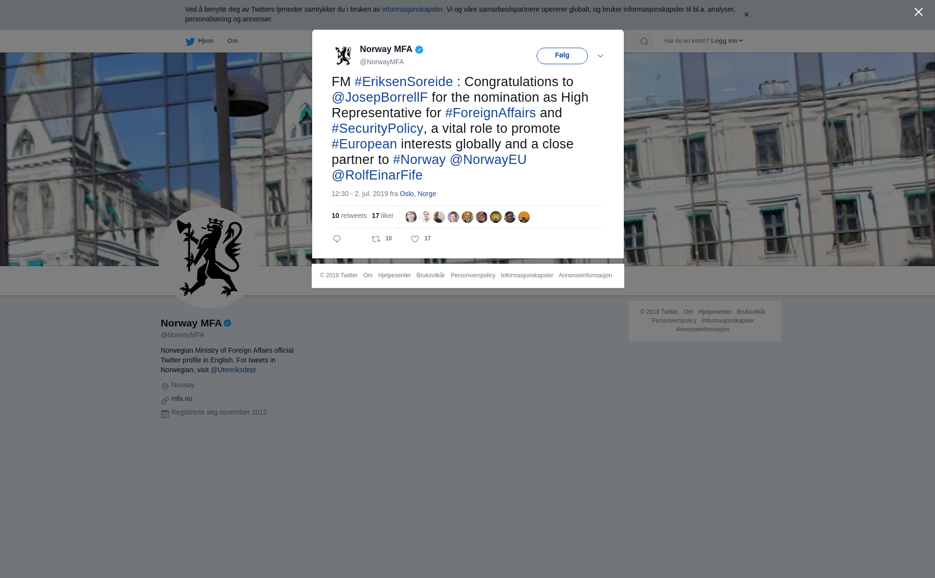FM #EriksenSoreide : Congratulations to @JosepBorrellF for the nomination as High Representative for #ForeignAffairs and #SecurityPolicy, a vital role to promote #European interests globally and a close partner to #Norway @NorwayEU @RolfEinarFife
