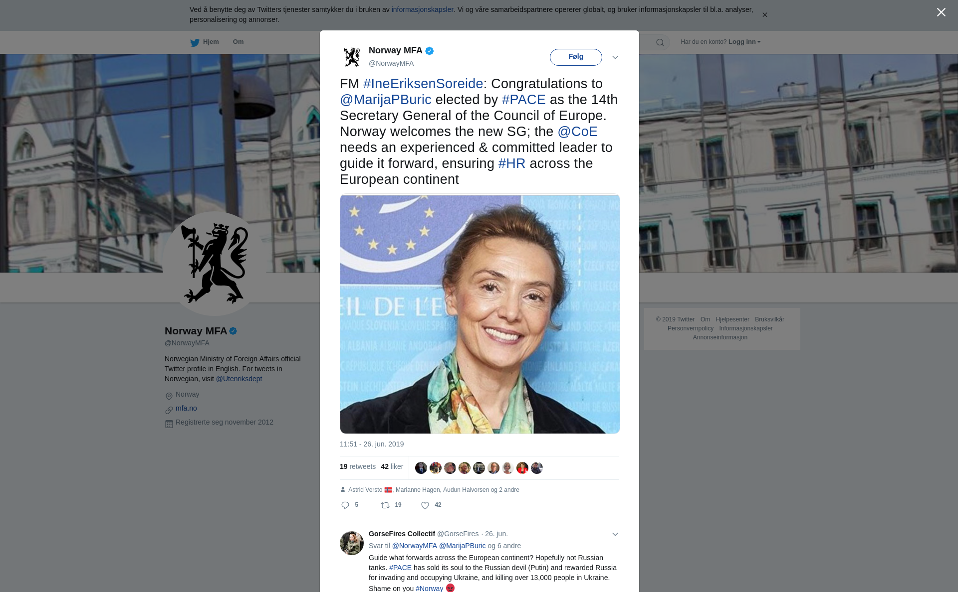 FM #IneEriksenSoreide: Congratulations to @MarijaPBuric elected by #PACE as the 14th Secretary General of the Council of Europe. Norway welcomes the new SG; the @CoE needs an experienced & committed leader to guide it forward, ensuring #HR across the European continent https://t.co/gML28tcuk4