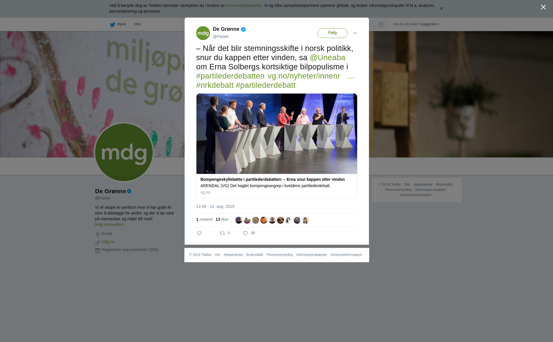 – Når det blir stemningsskifte i norsk politikk, snur du kappen etter vinden, sa @Uneaba om Erna Solbergs kortsiktige bilpopulisme i #partilederdebatten https://t.co/SnSAQkuW9m #nrkdebatt #partilederdebatt