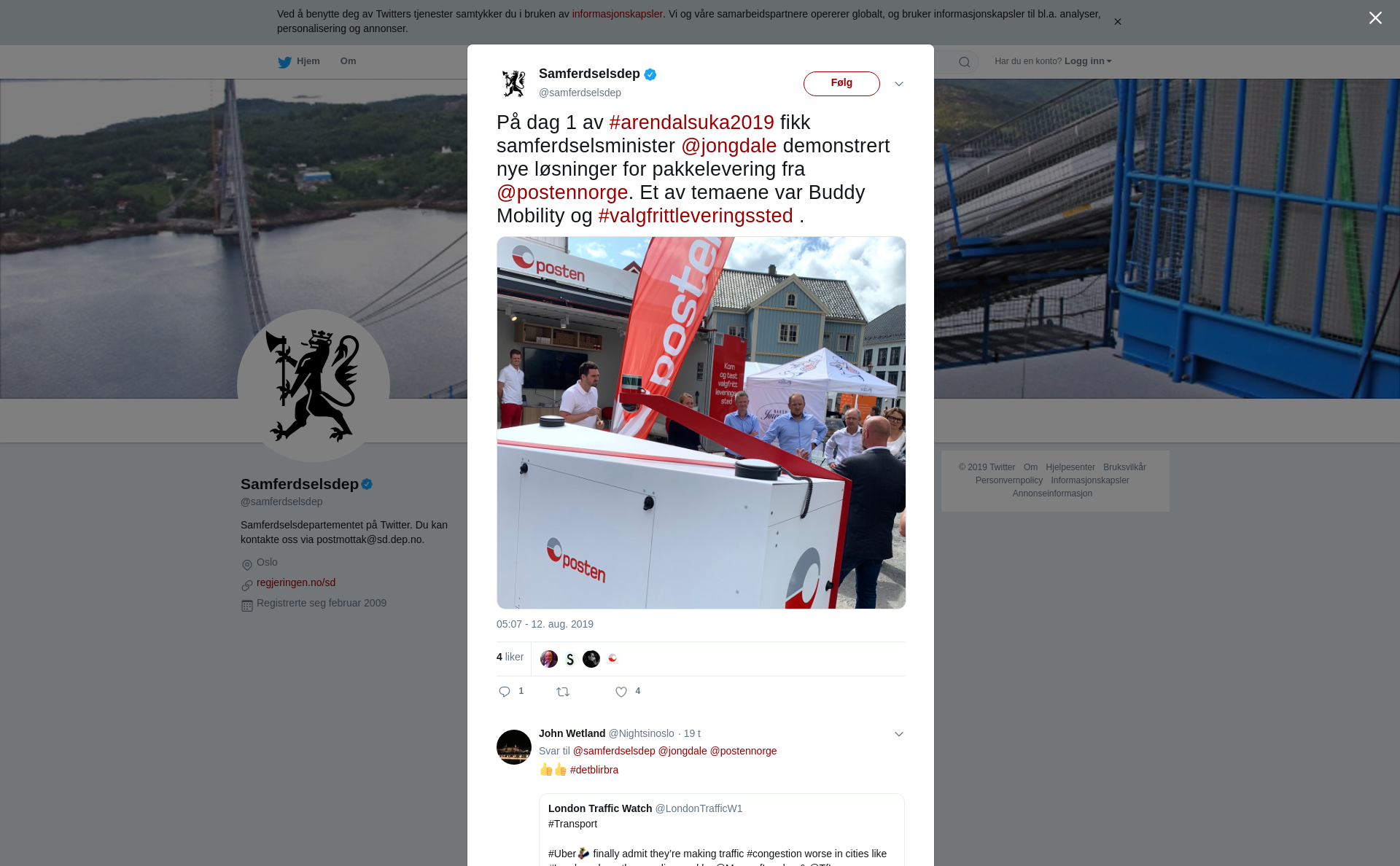 På dag 1 av #arendalsuka2019 fikk samferdselsminister @jongdale demonstrert nye løsninger for pakkelevering fra @postennorge. Et av temaene var Buddy Mobility og #valgfrittleveringssted . https://t.co/gCGmwuJ1R8