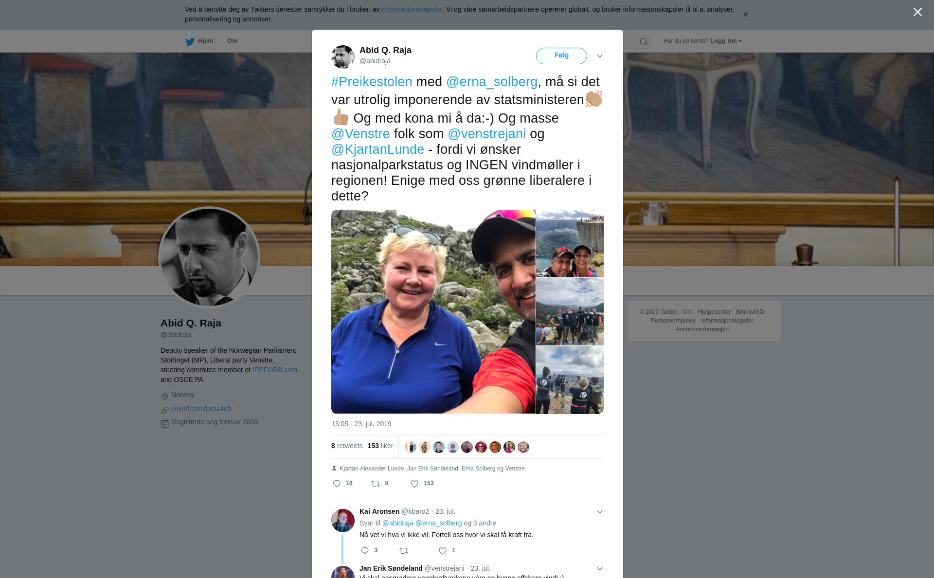 RT @abidraja: #Preikestolen med @erna_solberg, må si det var utrolig imponerende av statsministeren👏🏽👍🏽 Og med kona mi å da:-) Og masse @Venstre folk som @venstrejani og @KjartanLunde - fordi vi ønsker nasjonalparkstatus og INGEN vindmøller i regionen! Enige med oss grønne liberalere i dette? https://t.co/k9B8ej0hlr