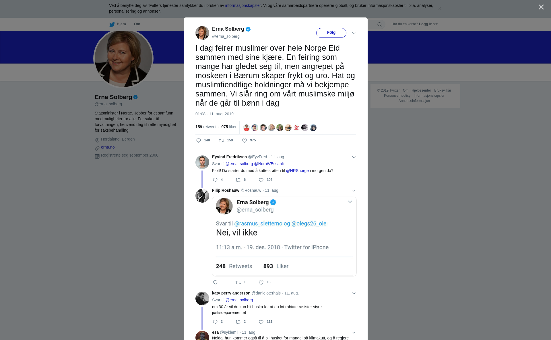 RT @erna_solberg: I dag feirer muslimer over hele Norge Eid sammen med sine kjære. En feiring som mange har gledet seg til, men angrepet på moskeen i Bærum skaper frykt og uro. Hat og muslimfiendtlige holdninger må vi bekjempe sammen. Vi slår ring om vårt muslimske miljø når de går til bønn i dag