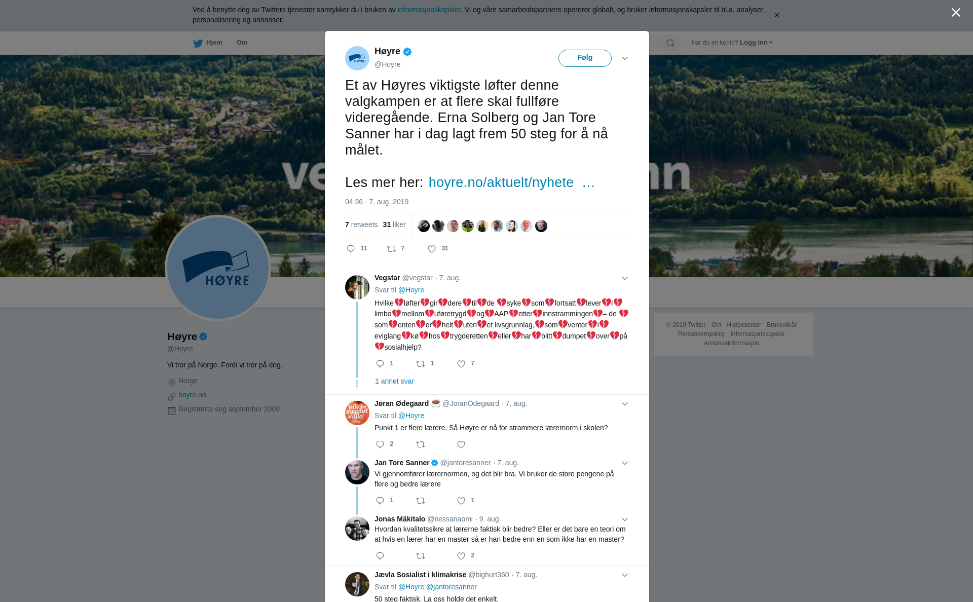 RT @Hoyre: Et av Høyres viktigste løfter denne valgkampen er at flere skal fullføre videregående. Erna Solberg og Jan Tore Sanner har i dag lagt frem 50 steg for å nå målet. Les mer her: https://t.co/KkVVak2FjM