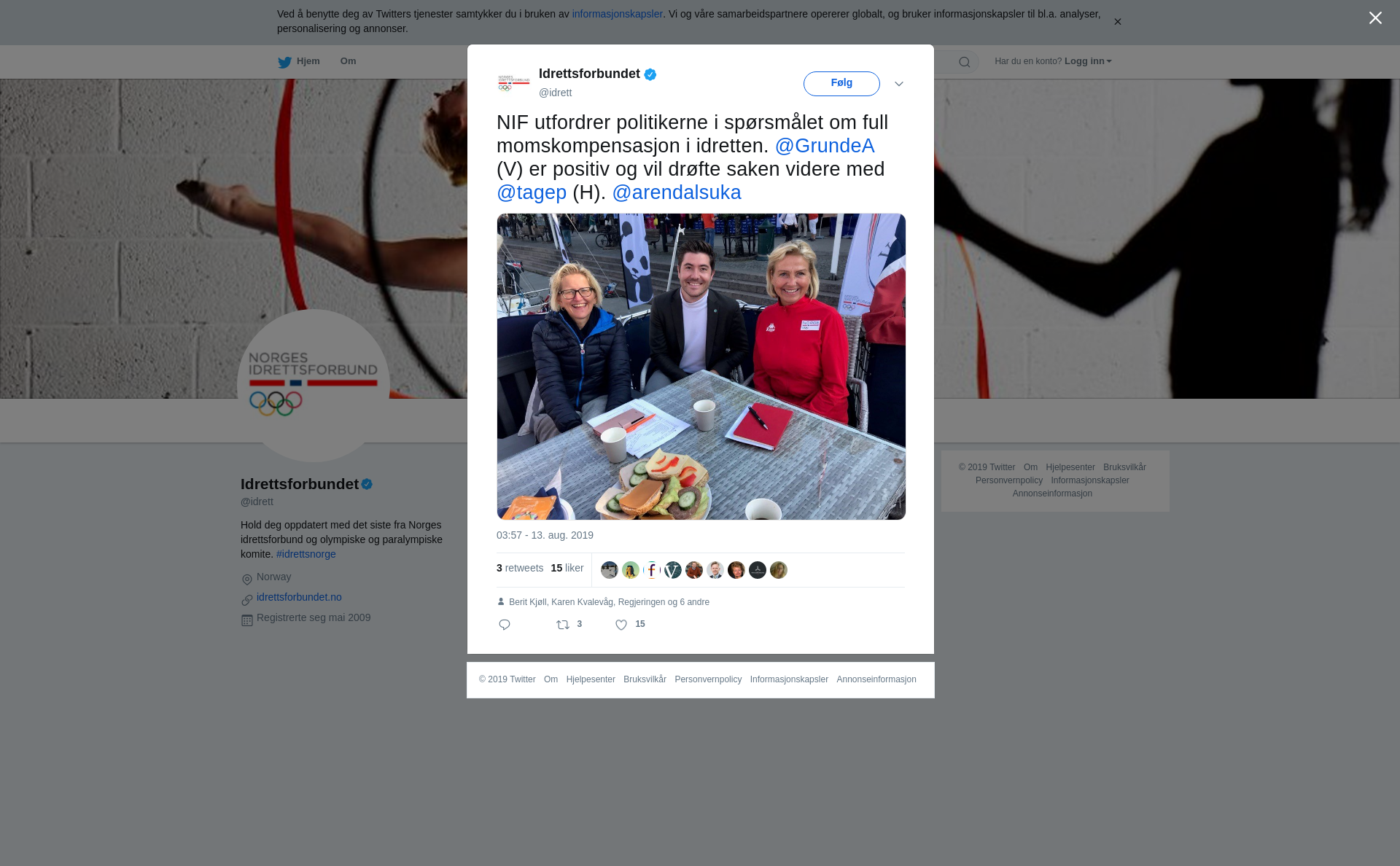 RT @idrett: NIF utfordrer politikerne i spørsmålet om full momskompensasjon i idretten. @GrundeA (V) er positiv og vil drøfte saken videre med @tagep (H). @arendalsuka https://t.co/FrLAhtKjx6