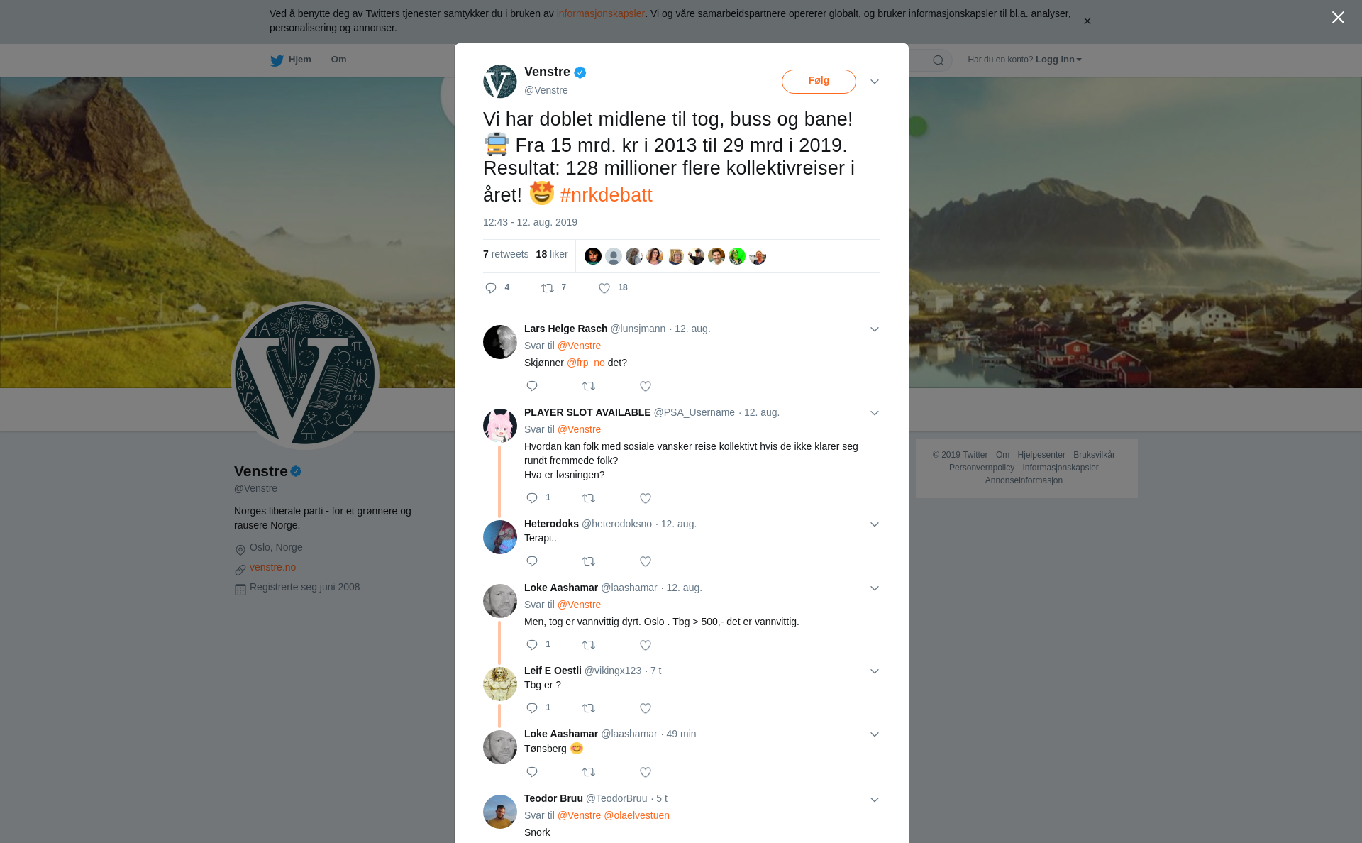 RT @Venstre: Vi har doblet midlene til tog, buss og bane! 🚍 Fra 15 mrd. kr i 2013 til 29 mrd i 2019. Resultat: 128 millioner flere kollektivreiser i året! 🤩 #nrkdebatt