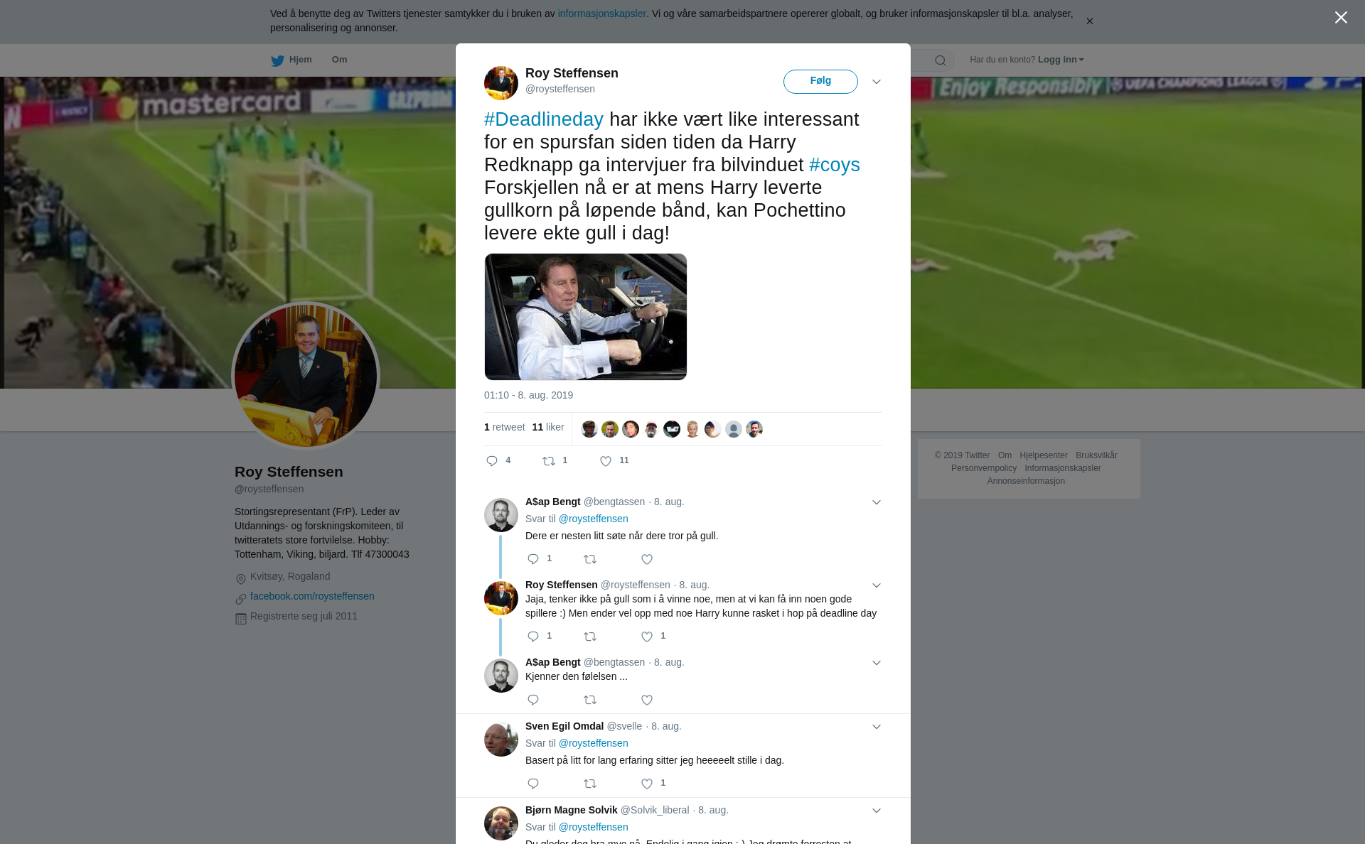 #Deadlineday har ikke vært like interessant for en spursfan siden tiden da Harry Redknapp ga intervjuer fra bilvinduet #coys Forskjellen nå er at mens Harry leverte gullkorn på løpende bånd, kan Pochettino levere ekte gull i dag! https://t.co/R2z23TGD8Q
