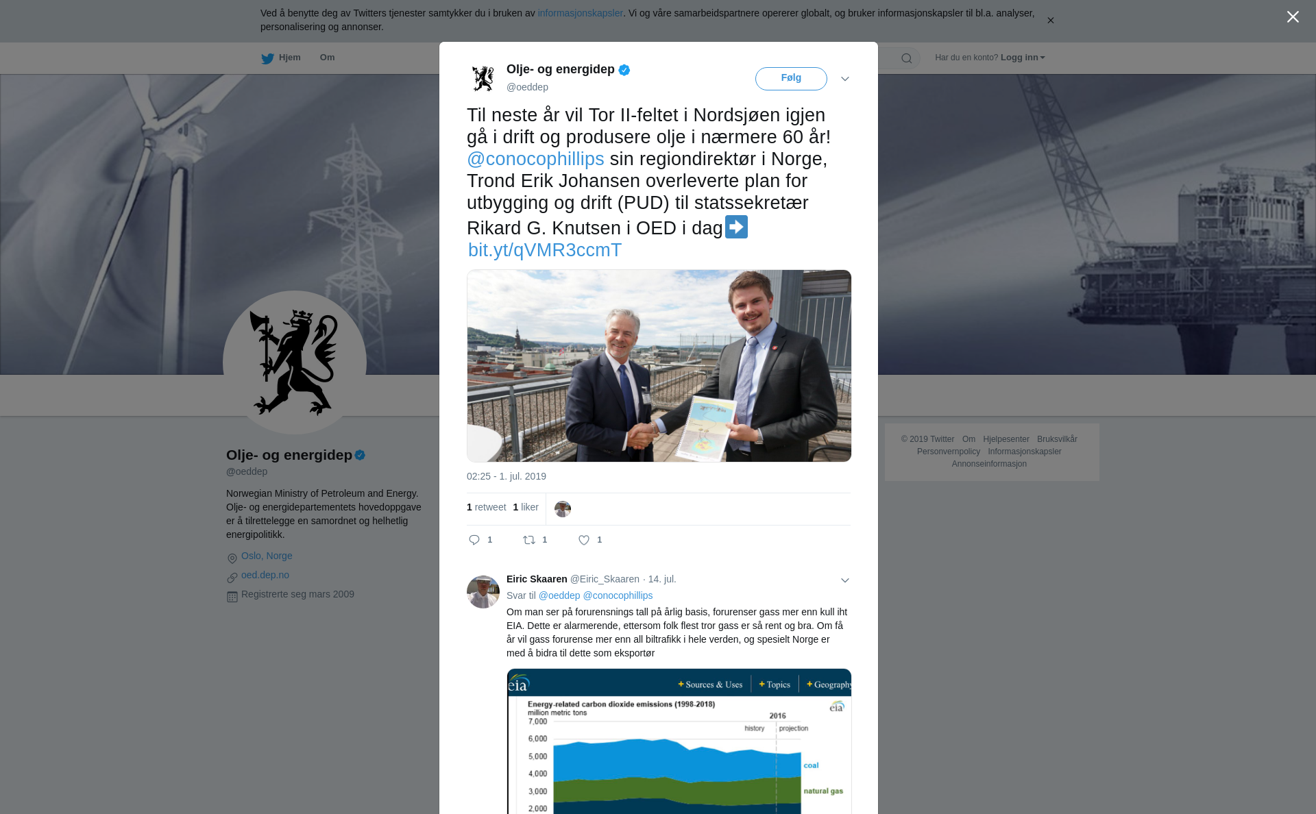 Til neste år vil Tor II-feltet i Nordsjøen igjen gå i drift og produsere olje i nærmere 60 år! @conocophillips sin regiondirektør i Norge, Trond Erik Johansen overleverte plan for utbygging og drift (PUD) til statssekretær Rikard G. Knutsen i OED i dag➡️https://t.co/03Hkz8srg9 https://t.co/36zKhu8SYc