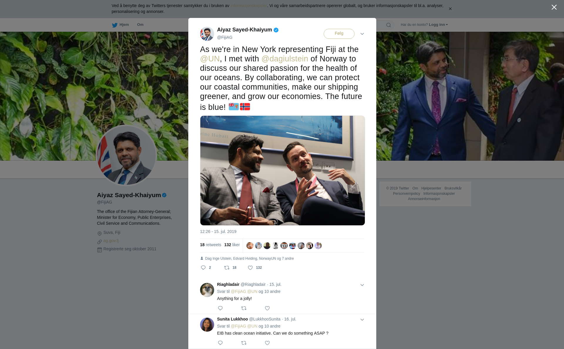 RT @FijiAG: As we're in New York representing Fiji at the @UN, I met with @dagiulstein of Norway to discuss our shared passion for the health of our oceans. By collaborating, we can protect our coastal communities, make our shipping greener, and grow our economies. The future is blue! 🇫🇯🇳🇴 https://t.co/pSVqgy7n9M