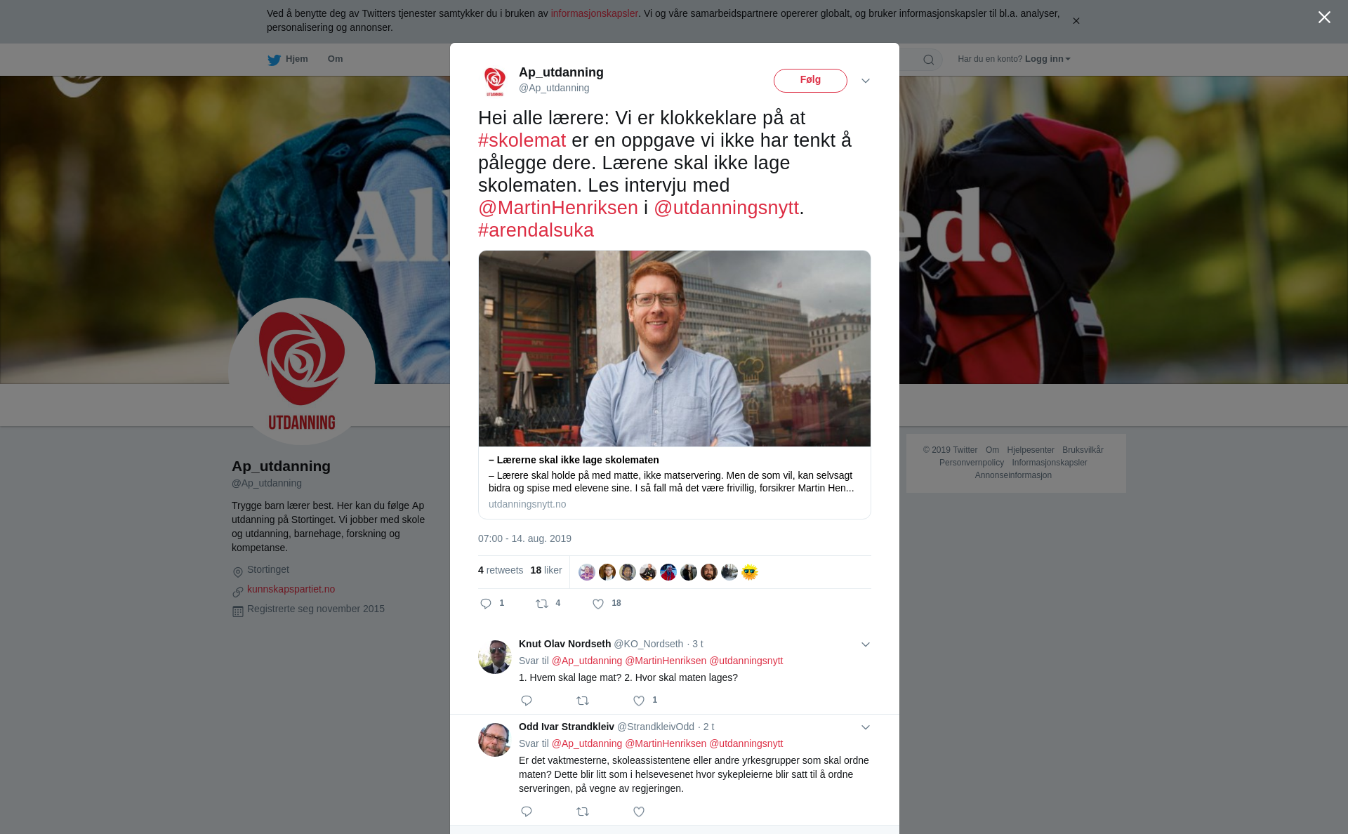 RT @Ap_utdanning: Hei alle lærere: Vi er klokkeklare på at #skolemat er en oppgave vi ikke har tenkt å pålegge dere. Lærene skal ikke lage skolematen. Les intervju med @MartinHenriksen i @utdanningsnytt. #arendalsuka https://t.co/UWNr1CvAZ1