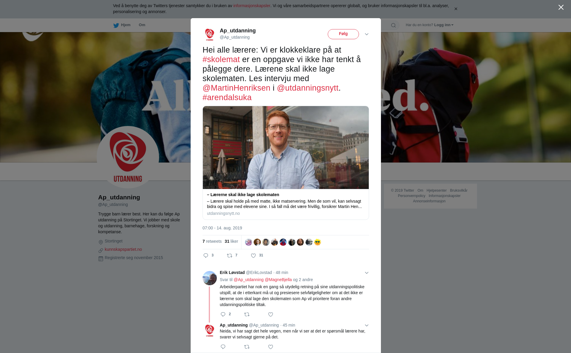 RT @Ap_utdanning: Hei alle lærere: Vi er klokkeklare på at #skolemat er en oppgave vi ikke har tenkt å pålegge dere. Lærene skal ikke lage skolematen. Les intervju med @MartinHenriksen i @utdanningsnytt. #arendalsuka https://t.co/UWNr1CvAZ1