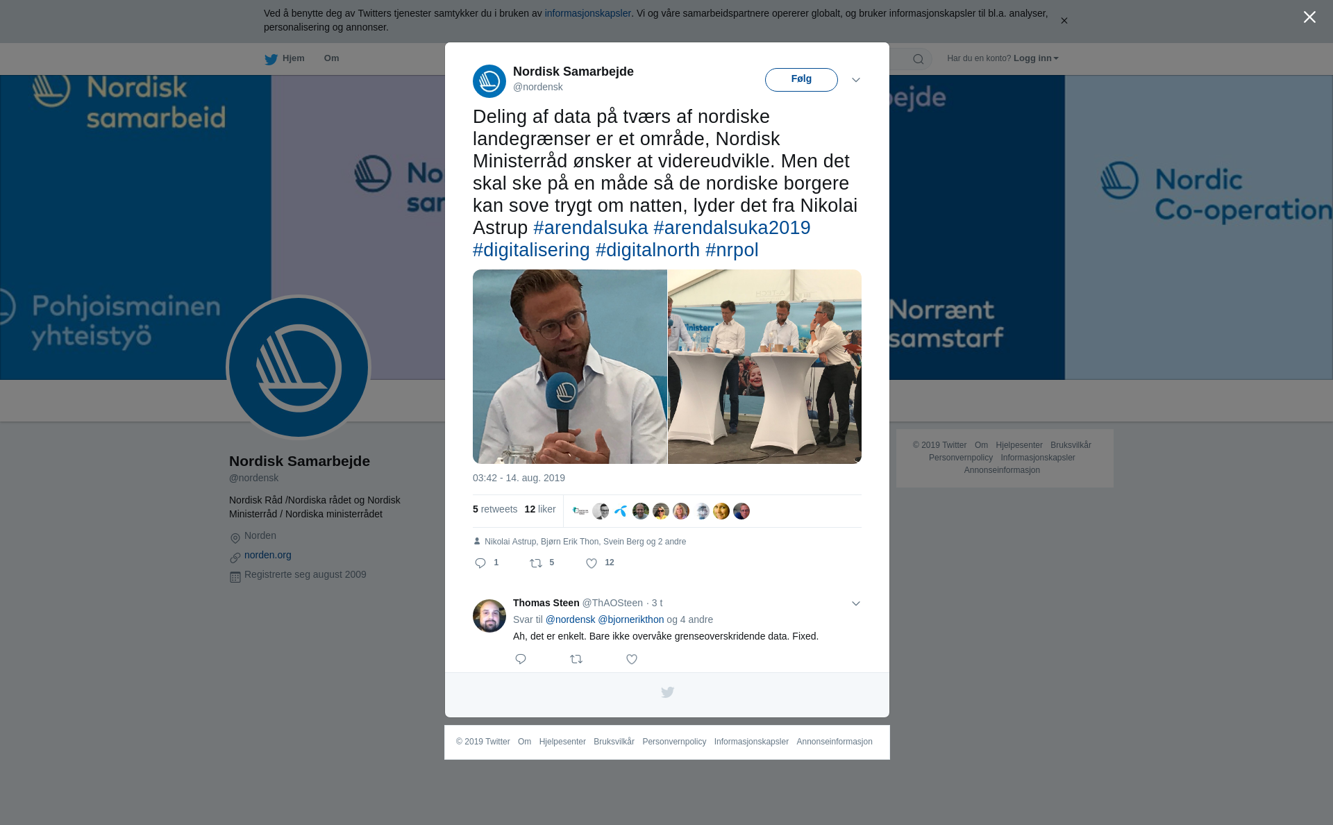 RT @nordensk: Deling af data på tværs af nordiske landegrænser er et område, Nordisk Ministerråd ønsker at videreudvikle. Men det skal ske på en måde så de nordiske borgere kan sove trygt om natten, lyder det fra Nikolai Astrup #arendalsuka #arendalsuka2019 #digitalisering #digitalnorth #nrpol https://t.co/Qljmk1RiK8
