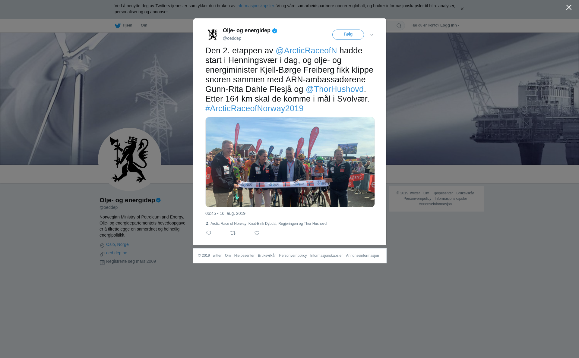Den 2. etappen av @ArcticRaceofN hadde start i Henningsvær i dag, og olje- og energiminister Kjell-Børge Freiberg fikk klippe snoren sammen med ARN-ambassadørene Gunn-Rita Dahle Flesjå og @ThorHushovd. Etter 164 km skal de komme i mål i Svolvær. #ArcticRaceofNorway2019 https://t.co/8HJhHJQ8Gs