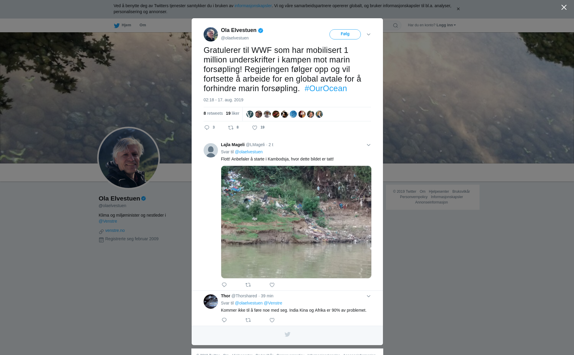 Gratulerer til WWF som har mobilisert 1 million underskrifter i kampen mot marin forsøpling! Regjeringen følger opp og vil fortsette å arbeide for en global avtale for å forhindre marin forsøpling. #OurOcean
