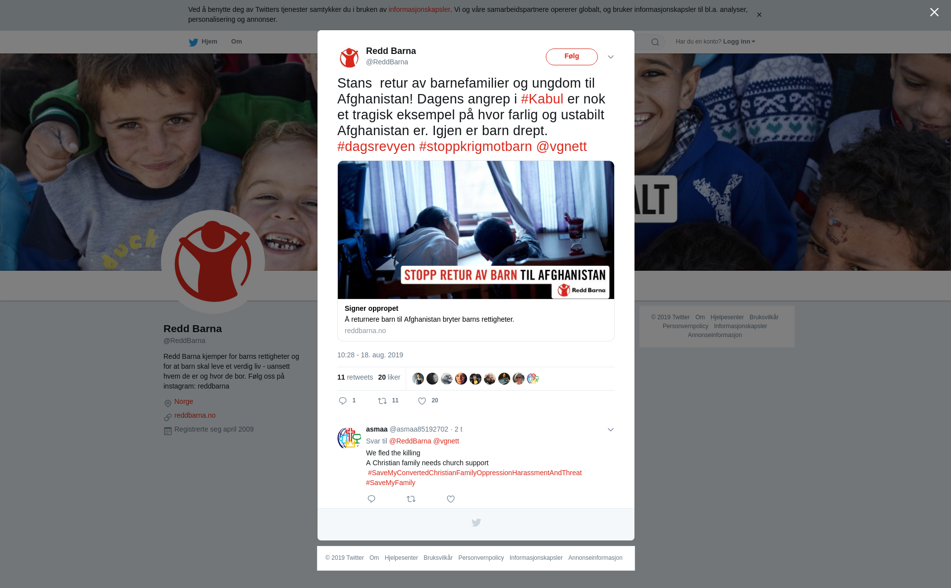 RT @ReddBarna: Stans retur av barnefamilier og ungdom til Afghanistan! Dagens angrep i #Kabul er nok et tragisk eksempel på hvor farlig og ustabilt Afghanistan er. Igjen er barn drept. #dagsrevyen #stoppkrigmotbarn @vgnett https://t.co/0AbNGfdclc
