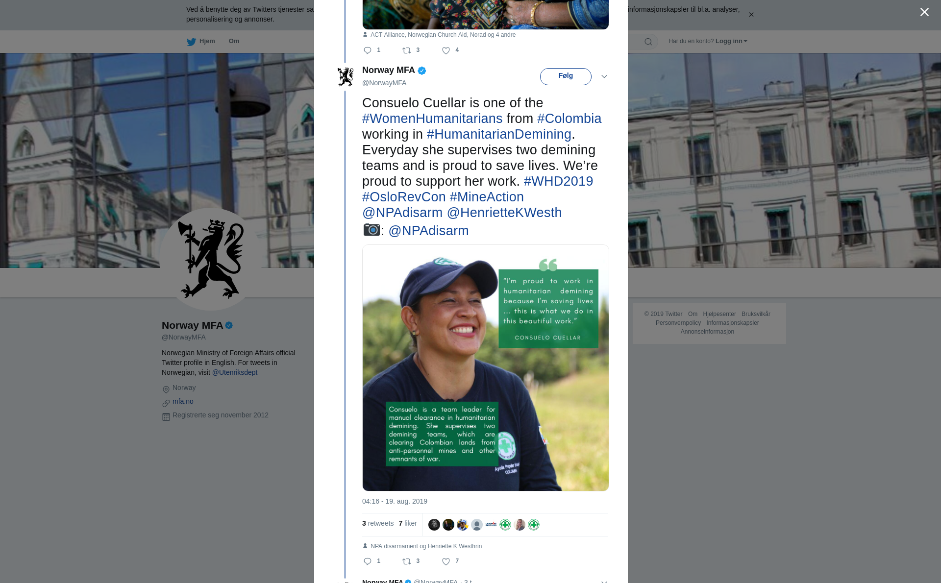 Consuelo Cuellar is one of the #WomenHumanitarians from #Colombia working in #HumanitarianDemining. Everyday she supervises two demining teams and is proud to save lives. We’re proud to support her work. #WHD2019 #OsloRevCon #MineAction @NPAdisarm @HenrietteKWesth