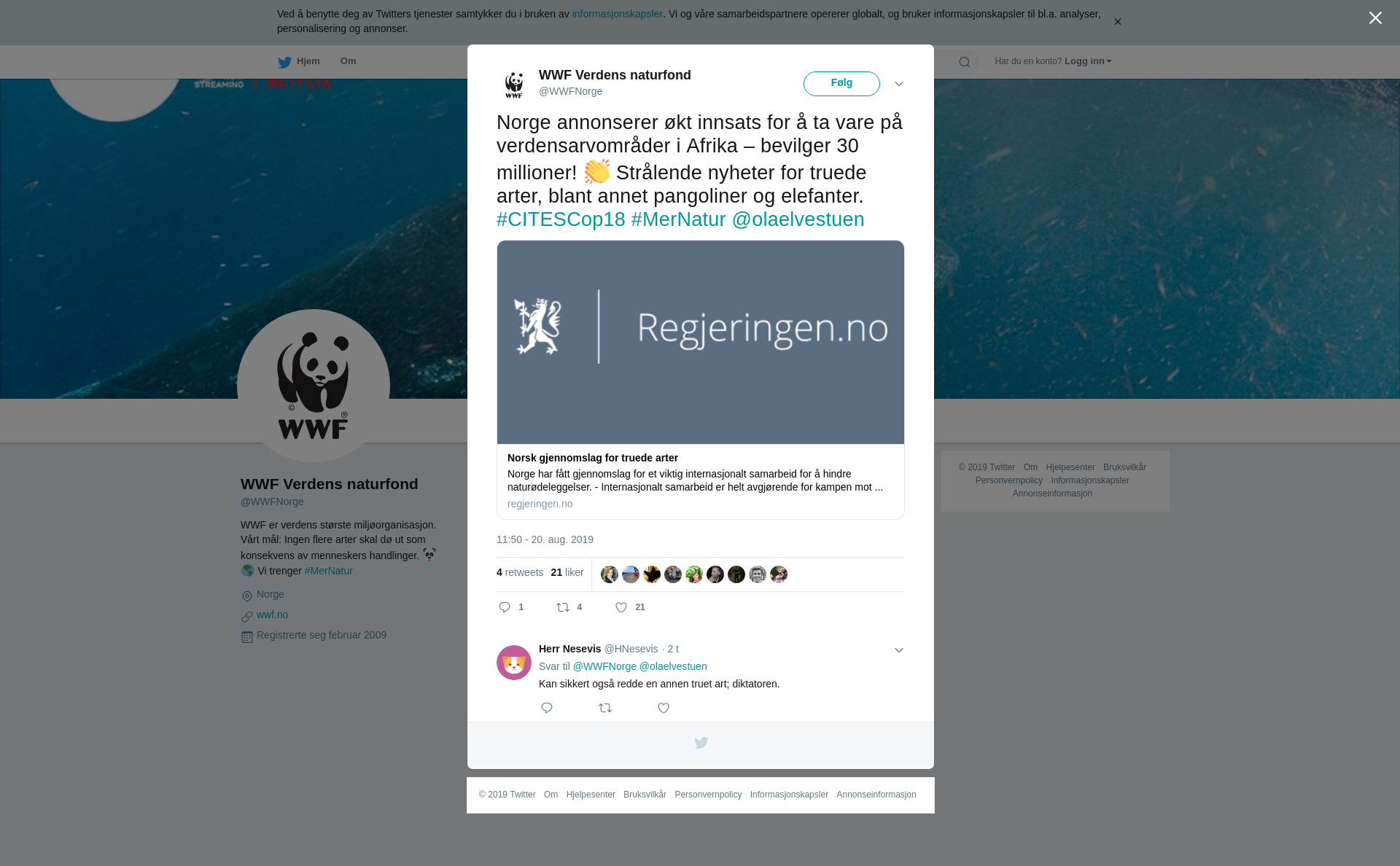 RT @WWFNorge: Norge annonserer økt innsats for å ta vare på verdensarvområder i Afrika – bevilger 30 millioner! 👏 Strålende nyheter for truede arter, blant annet pangoliner og elefanter. #CITESCop18 #MerNatur @olaelvestuen
