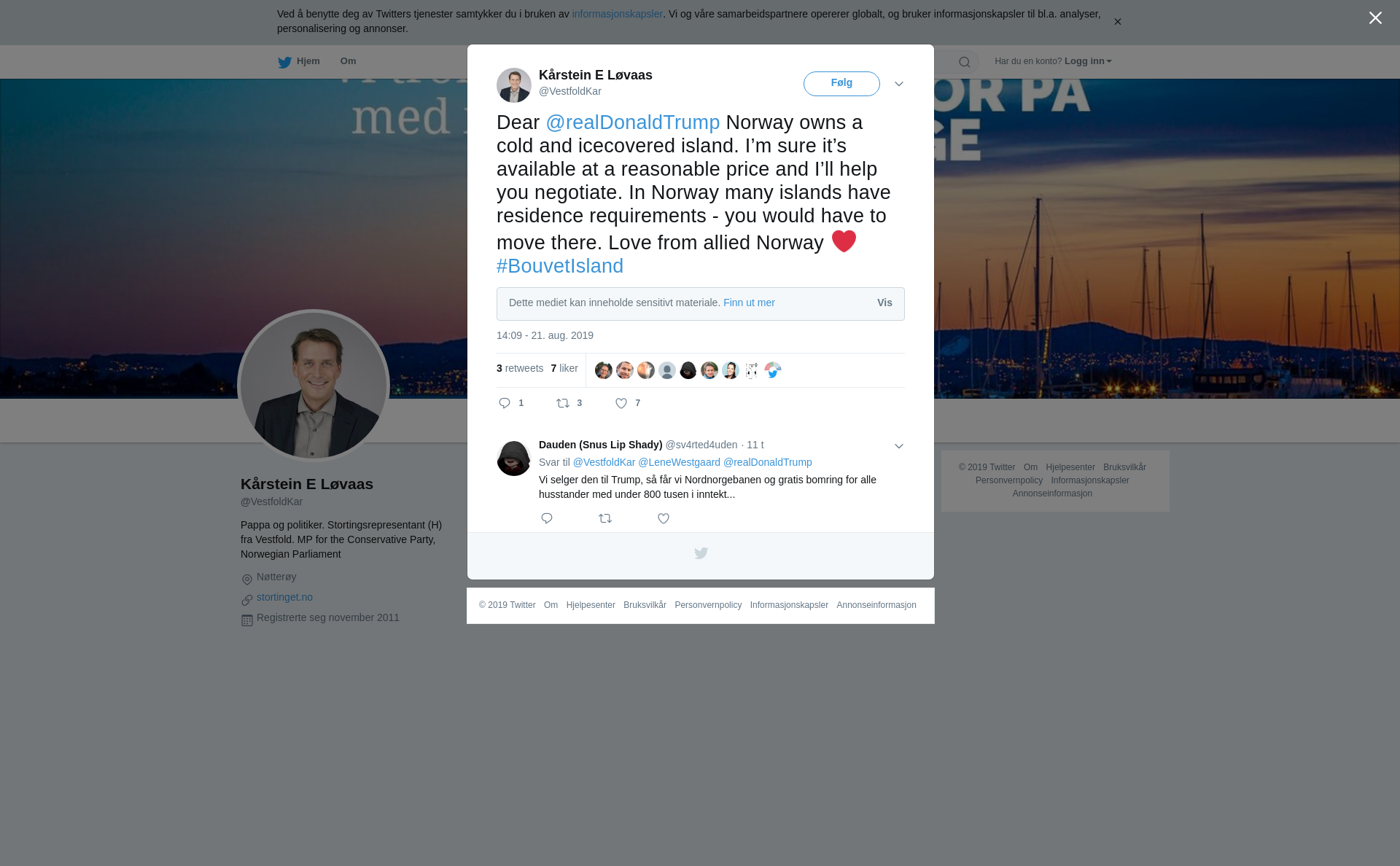 Dear @realDonaldTrump Norway owns a cold and icecovered island. I’m sure it’s available at a reasonable price and I’ll help you negotiate. In Norway many islands have residence requirements - you would have to move there. Love from allied Norway ❤️ #BouvetIsland https://t.co/DXfvYWC2sE