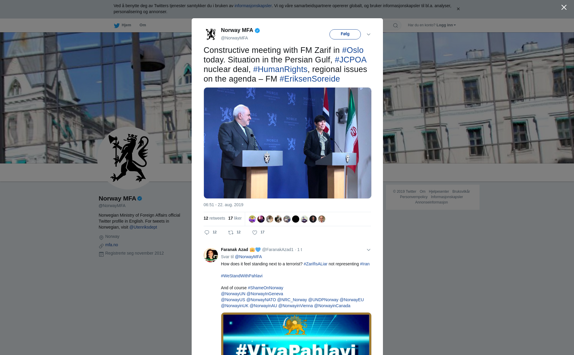 Constructive meeting with FM Zarif in #Oslo today. Situation in the Persian Gulf, #JCPOA nuclear deal, #HumanRights, regional issues on the agenda – FM #EriksenSoreide https://t.co/jPXn0TaV5K