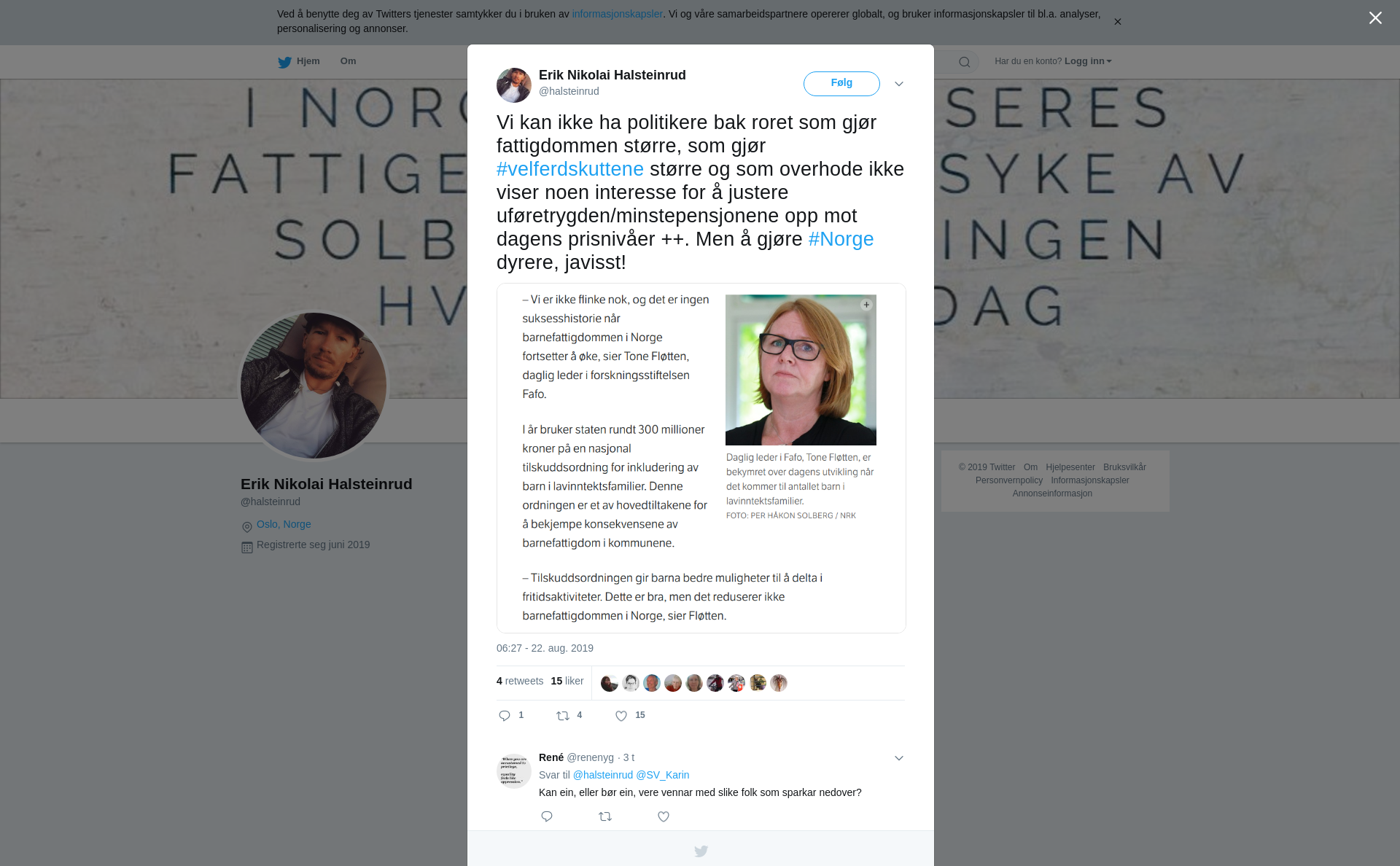 RT @halsteinrud: Vi kan ikke ha politikere bak roret som gjør fattigdommen større, som gjør #velferdskuttene større og som overhode ikke viser noen interesse for å justere uføretrygden/minstepensjonene opp mot dagens prisnivåer ++. Men å gjøre #Norge dyrere, javisst! https://t.co/pFsPidiwev