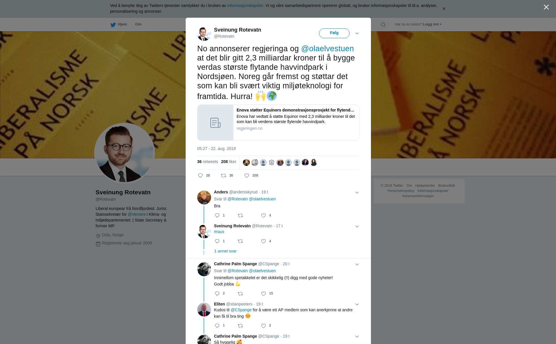 RT @Rotevatn: No annonserer regjeringa og @olaelvestuen at det blir gitt 2,3 milliardar kroner til å bygge verdas største flytande havvindpark i Nordsjøen. Noreg går fremst og støttar det som kan bli svært viktig miljøteknologi for framtida. Hurra! 🙌🌍 https://t.co/NLeejid1nE